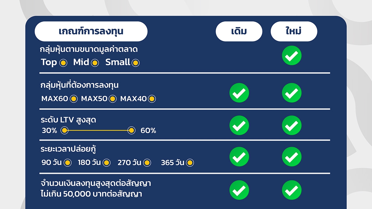 เริ่มเดินหน้าขยายทางเลือกให้กับผู้กู้ ที่ต้องการเพิ่มความยืดหยุ่นในการบริหารสภาพคล่อง ที่นอกจากจะสามารถนำหุ้นในตลาดหลักทรัพย์แห่งประเทศไทย (SET) มาใช้เป็นหลักทรัพย์ค้ำประกันได้แล้ว ในวันนี้ได้เปิดรับหุ้นในตลาด mai เป็นหลักประกันได้เช่นเดียวกัน โดยผู้กู้ไม่จำเป็นต้องขายหุ้นในพอร์ตออกไปแม้แต่หุ้นเดียว ซึ่งบริการนี้มาพร้อมอัตราดอกเบี้ยเริ่มต้นเพียง 5.95% ต่อปี