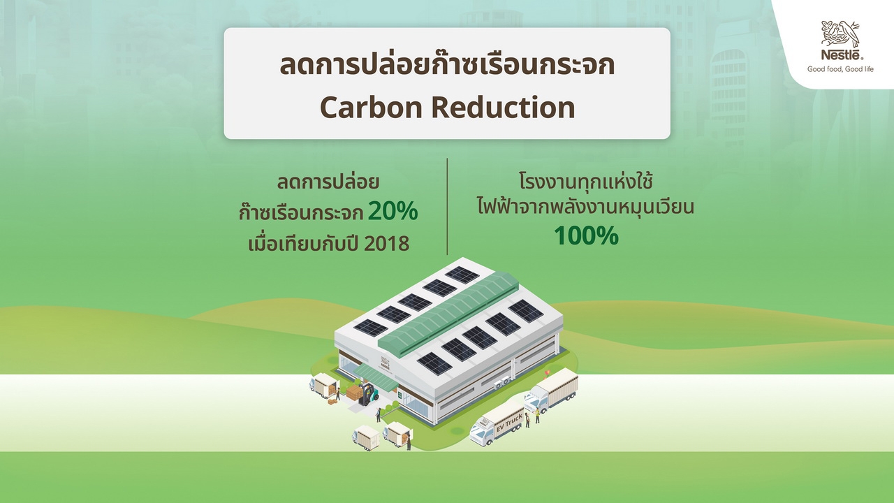 หัวใจสำคัญของการลดการปล่อยก๊าซเรือนกระจกคือการเปลี่ยนผ่านด้านพลังงาน และเนสท์เล่ ประเทศไทยได้สร้างมาตรฐานใหม่ที่น่าจับตา โรงงานทั้ง 8 แห่ง และศูนย์กระจายสินค้าทุกแห่งในประเทศไทยได้เปลี่ยนมาใช้ไฟฟ้าจากพลังงานหมุนเวียน 100% แล้ว โดยมาจากการใช้พลังงานสะอาด 2 ส่วนคือ ไฟฟ้าจากโซลาร์เซลล์ที่ติดตั้งในโรงงาน และ การได้ใบรับรองการผลิตพลังงานหมุนเวียน (Renewable Energy Certificate: REC) ซึ่งความสำเร็จดังกล่าวเกิดจากการดำเนินงานในหลายมิติร่วมกันตลอดห่วงโซ่คุณค่าตั้งแต่ต้นจนจบ
