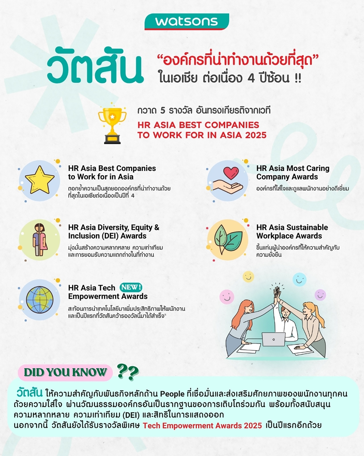สมคำร่ำลือ! วัตสัน ประเทศไทย ผู้นำร้านเพื่อสุขภาพและความงามอันดับหนึ่งของประเทศ สร้างปรากฏการณ์ความสำเร็จระดับสากลอีกครั้ง ด้วยการกวาดรางวัลอันทรงเกียรติ “HR Asia Best Companies to Work for in Asia 2025” ถึง 5 รางวัล