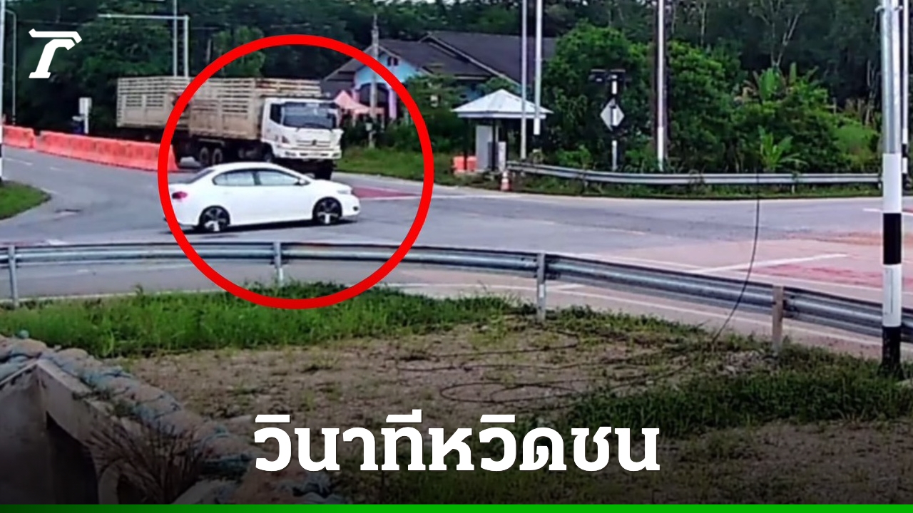 วินาทีระทึก กล้องวงจรปิดจับภาพ "รถพ่วง 18 ล้อ" หวิดชน "รถเก๋ง" กลางสี่แยก ด้านชาวบ้านวอนเจ้าหน้าที่ไฟจราจร หลังเสียมานานกว่าครึ่งเดือนแล้ว