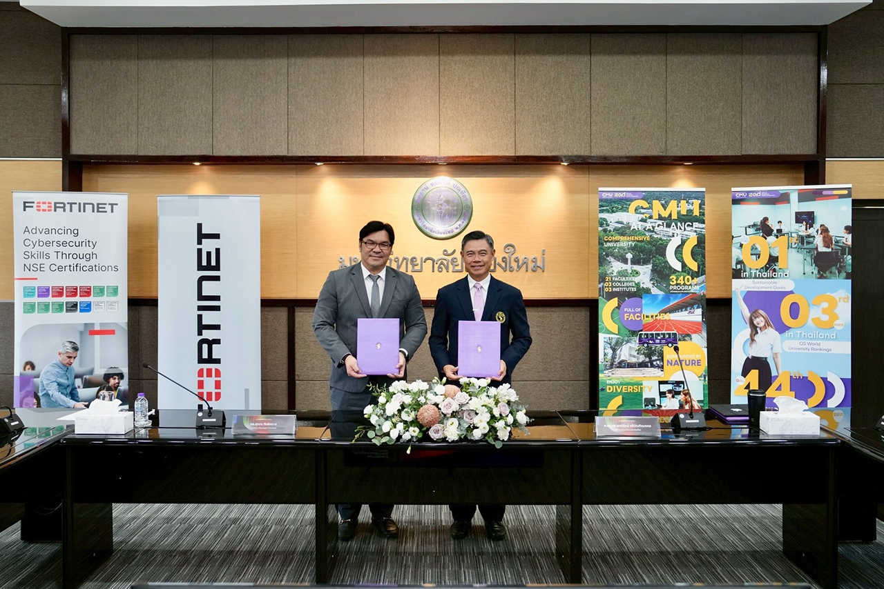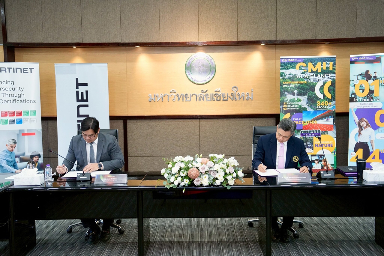 มหาวิทยาลัยเชียงใหม่ลงนามบันทึกข้อตกลงความร่วมมือทางวิชาการ (MOU) กับบริษัท ฟอร์ทิเนท ซีเคียวริตี้ เน็ทเวิร์ค (ประเทศไทย) จำกัด เพื่อร่วมเป็นพันธมิตรทางวิชาการ (Academic Partner) ภายใต้หลักสูตร Fortinet Network Security Expert (NSE) โดยมีเป้าหมายในการพัฒนาความรู้และทักษะด้านความมั่นคงปลอดภัยไซเบอร์ให้แก่นักศึกษาและบุคลากรของมหาวิทยาลัย เสริมศักยภาพด้านการเรียนการสอนให้สอดคล้องกับความต้องการของอุตสาหกรรมเทคโนโลยีในระดับโลก พิธีลงนามจัดขึ้นเมื่อวันที่ 22 ตุลาคม 2568 ณ ห้องประชุมบัวเรศ คำทอง สำนักงานมหาวิทยาลัย มหาวิทยาลัยเชียงใหม่ โดยมี ศาสตราจารย์ ดร.นายแพทย์พงษ์รักษ์ ศรีบัณฑิตมงคล อธิการบดีมหาวิทยาลัยเชียงใหม่ ให้การต้อนรับ ดร.ศุภกร กังพิศดาร Country Manager บริษัท ฟอร์ทิเนท ซีเคียวริตี้ เน็ทเวิร์ค (ประเทศไทย) จำกัด และคณะผู้บริหาร