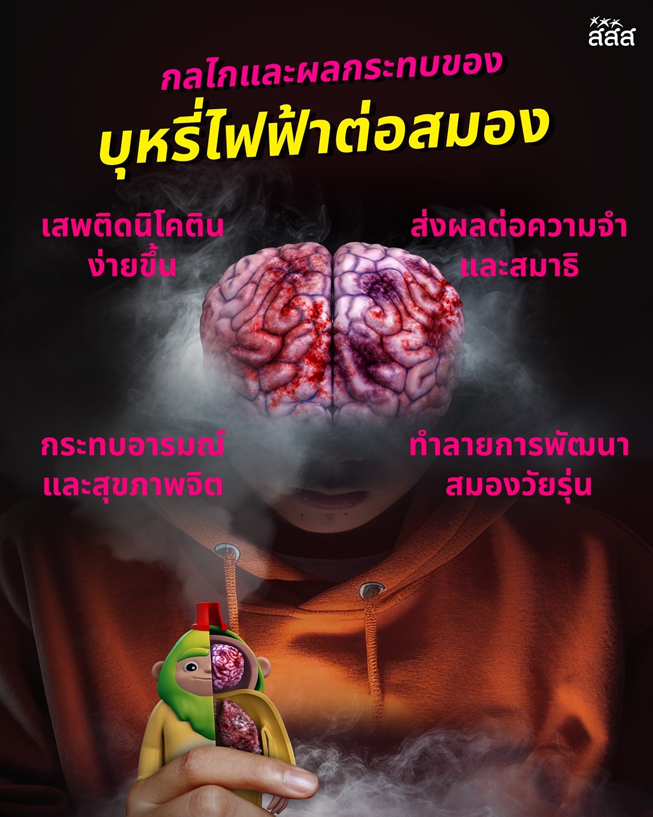 พูดง่ายๆ คือ บุหรี่ไฟฟ้าขโมยอนาคตสมองของวัยรุ่นไปทีละนิด บุหรี่ไฟฟ้าไม่ได้ปลอดภัยกว่าบุหรี่มวน แต่ถูกออกแบบให้ดู “ห่างไกลบุหรี่” เพื่อปกปิดความจริงว่า ข้างในเต็มไปด้วย สารพิษที่ซ่อนร้าย และสิ่งที่ถูกทำลายอย่างหนักที่สุดคือตัวผู้สูบ และสมองของผู้สูบ