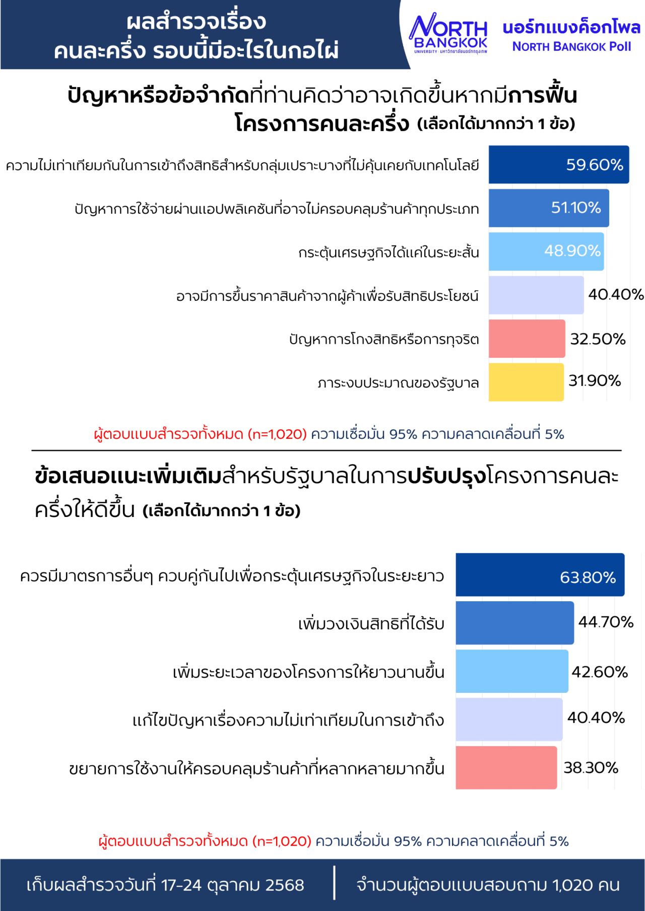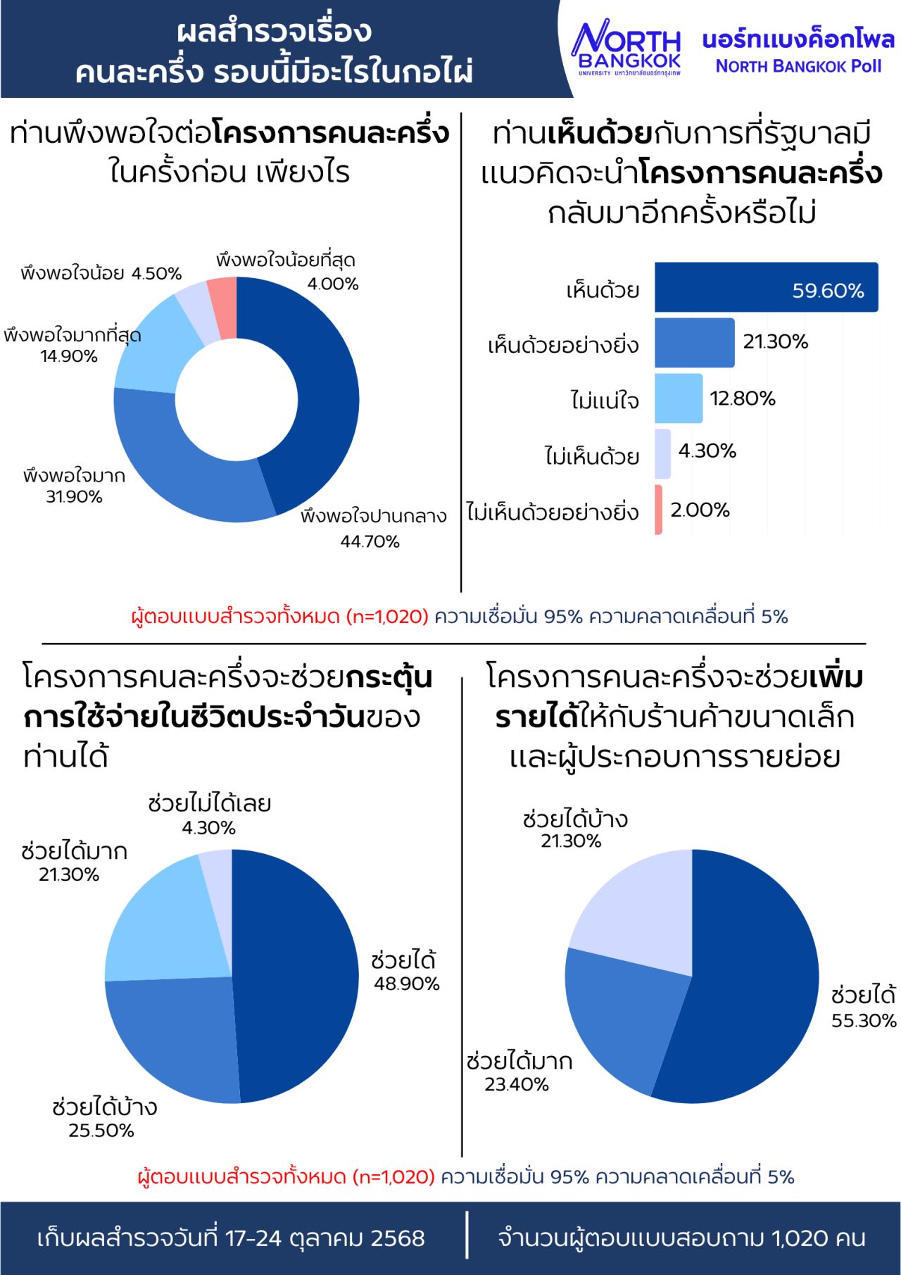 วันที่ 28 ตุลาคม 2568 ผศ. ดร. สานิต ศิริวิศิษฐ์กุล หัวหน้าศูนย์สำรวจความคิดเห็น นอร์ทแบงค็อกโพล มหาวิทยาลัยนอร์ทกรุงเทพ เปิดเผยว่า จากการสำรวจความคิดเห็นของประชาชน ระหว่างวันที่ 17- 24 ตุลาคม 2568 จากจำนวน 1,002 ตัวอย่าง จากกลุ่มตัวอย่างทุกภูมิภาคทั่วประเทศในประเด็น "คนละครึ่ง รอบนี้มีอะไรในกอไผ่" ต่อข้อคำถาม