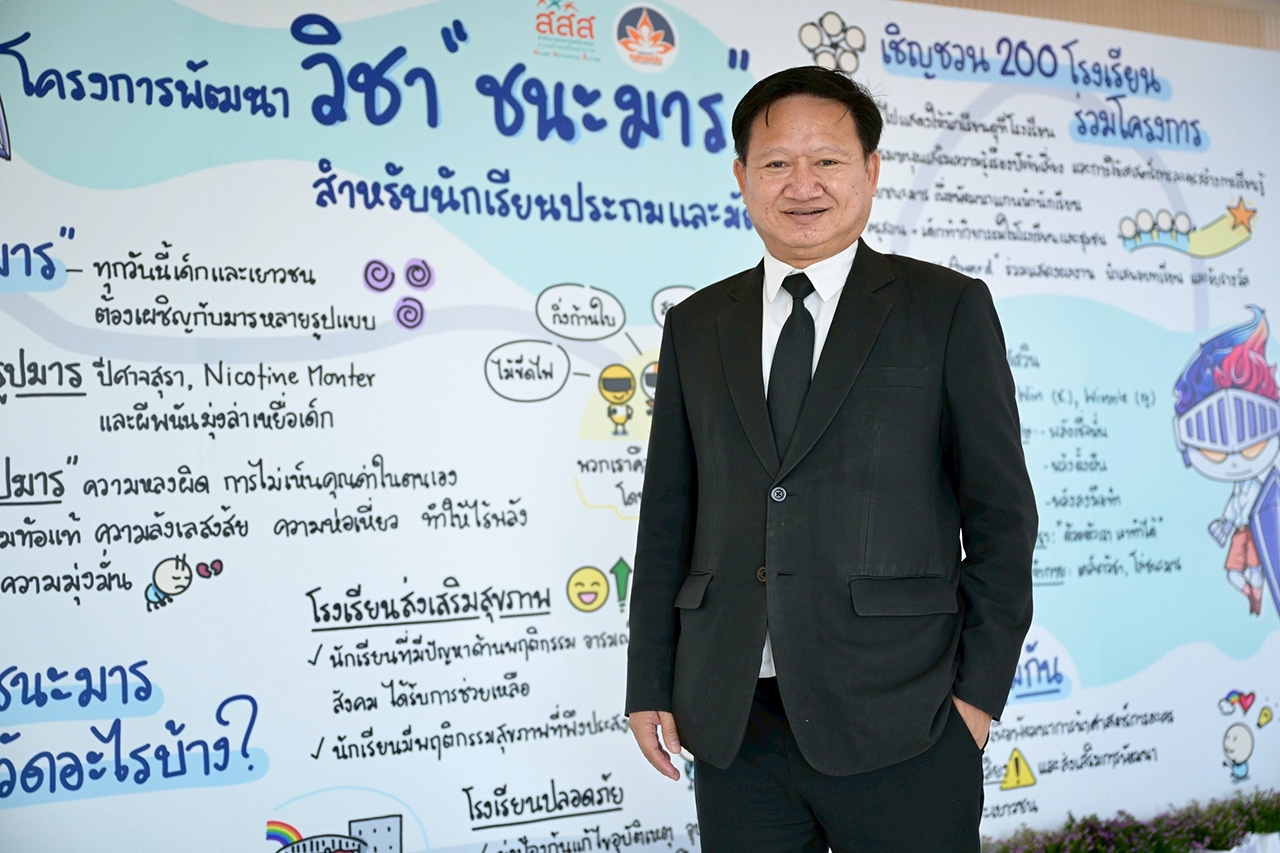 นพ.พงศ์เทพ วงศ์วัชรไพบูลย์ ผู้จัดการกองทุน สสส. กล่าวว่า ขณะนี้มีเด็กและเยาวชนเปรียบเหมือนมีมารอยู่รอบตัว จากการถูกชักชวนให้เข้าไปเกี่ยวข้องกับปัจจัยเสี่ยง ทั้งบุหรี่ไฟฟ้า พนันออนไลน์ และเครื่องดื่มแอลกอฮอล์ ในปี 2567 มีเยาวชนสูบบุหรี่ไฟฟ้าเพิ่มขึ้นถึง 5.3 เท่า ส่วนหนึ่งมาจากกลยุทธ์การตลาดแบบล่าเหยื่อ ที่ออกแบบผลิตภัณฑ์ที่ล่อใจเด็ก เช่น เป็นตุ๊กตา “ทอยพอด” หรือล่าสุดก็ทำมาในรูปลักษณ์เหมือนยาดม ที่เรียกกันว่า “พอดจมูก” เด็ก ๆ หารู้ไม่ว่า ในบุหรี่ไฟฟ้า 1 แท่ง มีนิโคตินเข้มข้นและอันตรายมากเทียบเท่าการสูบบุหรี่ 20 มวน ส่วนการดื่มเครื่องดื่มแอลกอฮอล์ของเด็กเยาวชน พบว่า 33.06% มีการดื่มแล้วขับ นำมาสู่การเกิดอุบัติเหตุและเสียชีวิตก่อนวัยอันควร ขณะที่พนันออนไลน์ก็แพร่ระบาดมาถึงตัวเด็ก ผลสำรวจ 2 ปีก่อนหน้านี้ พบว่า 32.3% ของเด็กเยาวชนคนรุ่นใหม่เล่นการพนันออนไลน์ เฉลี่ยคนละ 1,633 บาทต่อเดือน คิดเป็นเงินที่ถูกล่อลวงถึง 58,675 ล้านบาท