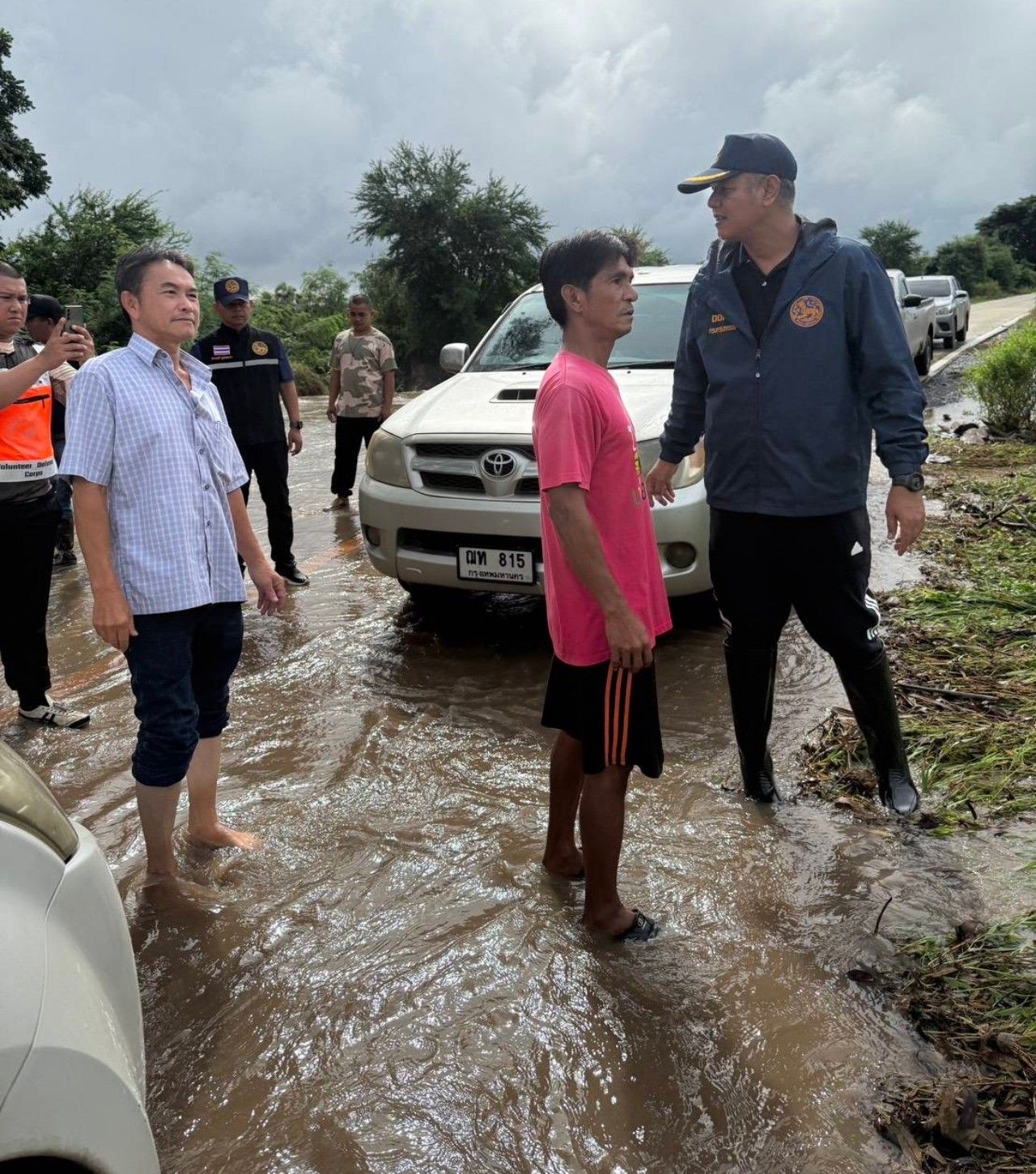 โอกาสนี้ นายชวโรจน์ มากแก้ว นายอำเภอบ่อพลอย กล่าวว่าสถานการณ์น้ำท่วมในพื้นที่เกิดจากสภาพอากาศแปรปรวน โดยอำเภอบ่อพลอยประสบปัญหาฝนตกหนักเมื่อ 31 ต.ค. 2568 ปริมาณน้ำบนภูเขาได้สะสมน้ำแล้วไหลบ่าลงมาท่วมพืชไร่ทางการเกษตร และบ้านเรือนประชาชน ฟาร์มปศุสัตว์ ซึ่งอยู่ระหว่างการช่วยเหลือรวมถึงสำรวจความเสียหายอยู่