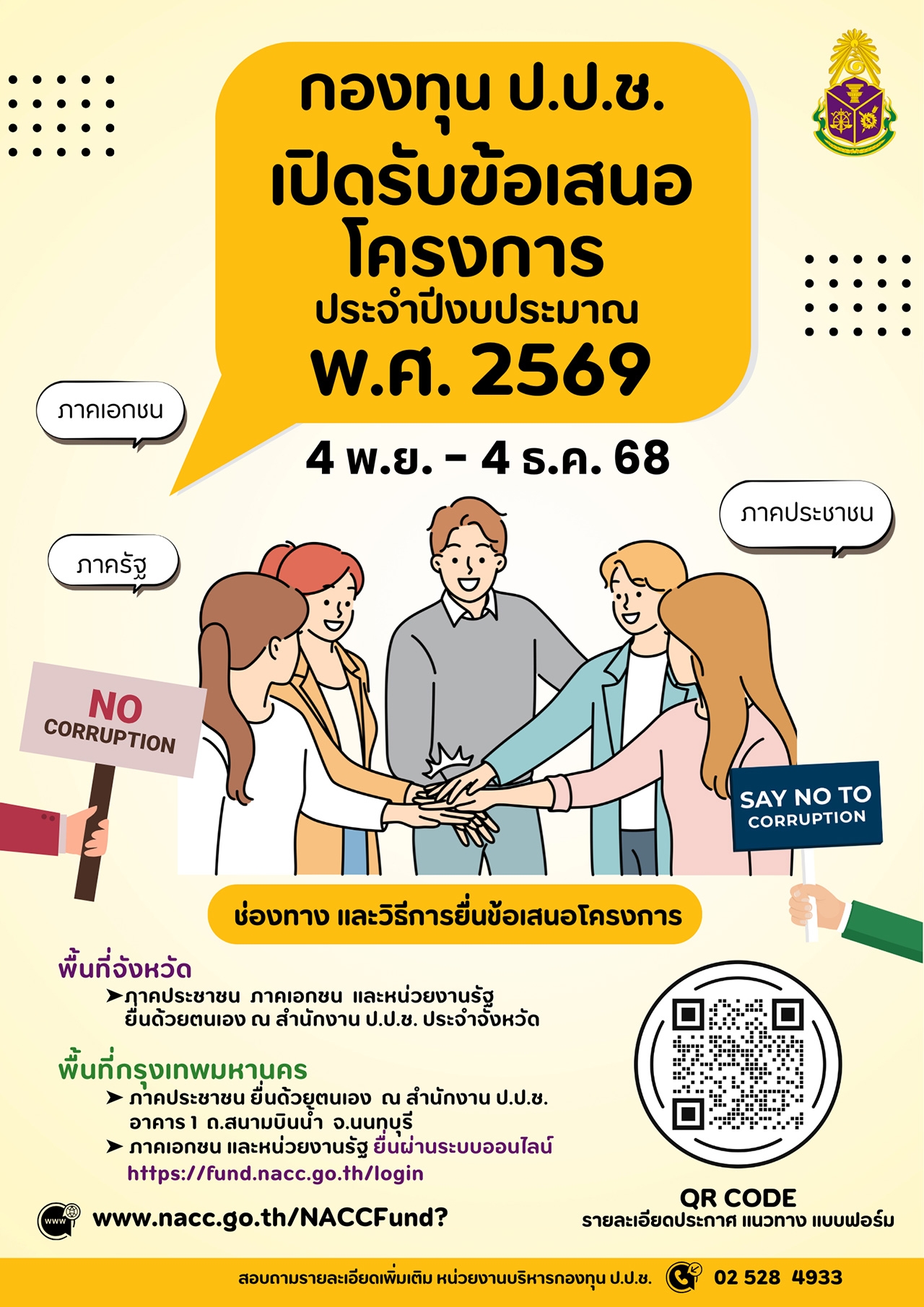 ผู้ที่สนใจยื่นข้อเสนอโครงการฯ สามารถศึกษารายละเอียด ประกาศ แนวทางการจัดทำข้อเสนอโครงการ และดาวน์โหลดแบบฟอร์มต่าง ๆ ได้ที่เว็บไซต์ กองทุน ป.ป.ช. หัวข้อ “การขอรับการสนับสนุน”(https://www.nacc.go.th/NACCFund?) ช่องทางการยื่นข้อเสนอโครงการฯ (1) พื้นที่จังหวัด ภาคประชาชน ภาคเอกชน และหน่วยงานรัฐ ยื่นด้วยตนเอง ณ สำนักงาน ป.ป.ช. ประจำจังหวัด (2) พื้นที่กรุงเทพมหานคร ภาคประชาชน ยื่นด้วยตนเอง ณ สำนักงาน ป.ป.ช. อาคาร 1 (ถนนสนามบินน้ำ) จังหวัดนนทบุรี ภาคเอกชน และหน่วยงานรัฐ ยื่นผ่านระบบออนไลน์ https://fund.nacc.go.th/login ตั้งแต่วันที่ 4 พฤศจิกายน – 4 ธันวาคม 2568
