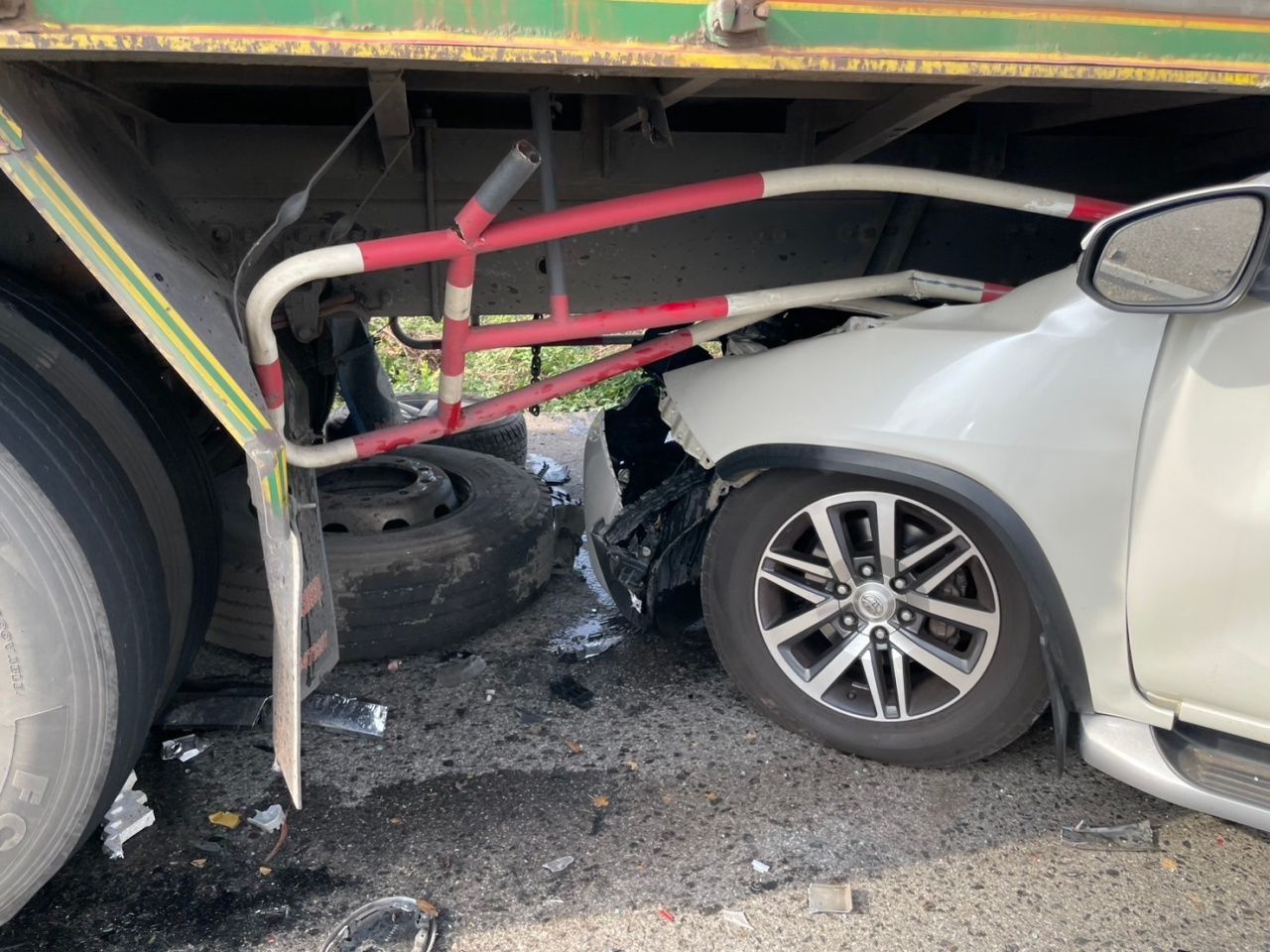 ที่เกิดเหตุพบรถฟอร์จูนเนอร์สีขาว ทะเบียนฉะเชิงเทรา ชนอัดก๊อปปี้ท้ายรถหกล้อตู้แห้ง ยี่ห้อฮีโน่พีเคอี 250 ทะเบียนป้ายเหลือง กรุงเทพมหานคร ทราบชื่อผู้ขับขี่รถหกล้อต่อมาคือ นายอมร และผู้บาดเจ็บจากรถฟอร์จูนเนอร์อีก 2 ราย ติดภายในรถ 1 ราย ทราบชื่อต่อมาคือ นายสุเมธ อายุ 35 ปี และให้การช่วยเหลือออกมานำส่งโรงพยาบาลพนมสารคาม ส่วนอีก 1 รายที่ติดภายใน ซึ่งเป็นคนขับนั้นเจ้าหน้าที่ได้ใช้เครื่องตัดถ่างนำร่างผู้บาดเจ็บออกมาโดยใช้เวลาประมาณ 10 นาที ทราบชื่อต่อมาคือ นางวิภา อายุ 63 ปี เป็นผู้ขับขี่ ซึ่งรอดปาฏิหาริย์จากการถูกอัดก๊อปปี้จากสภาพรถที่มุดอยู่ใต้ท้องรถหกล้อและนำส่งรักษาต่อที่โรงพยาบาลพนมสารคาม