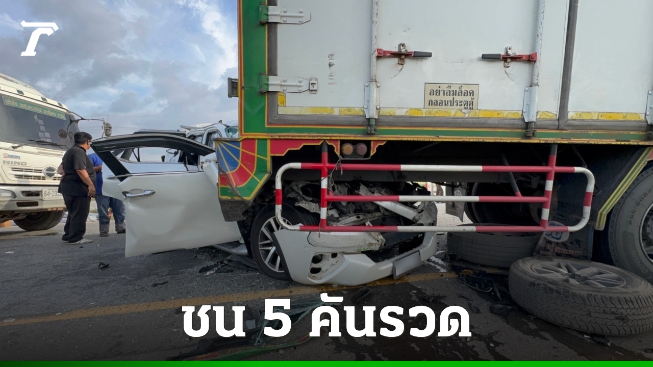 อุบัติเหตุหมู่ชนสนั่น 5 คันรวด รถหกล้อตู้แห้งแซงพุ่งชนท้ายรถสิบล้อ ทำให้รถยนต์นั่งส่วนบุคคลที่ขับตามมาชนท้ายรถหกล้อเข้าอย่างจังอัดก๊อปปี้ติดภายใน ขณะที่รถบัสที่วิ่งตามกันมาชนท้ายเสียหลักลงข้างทาง