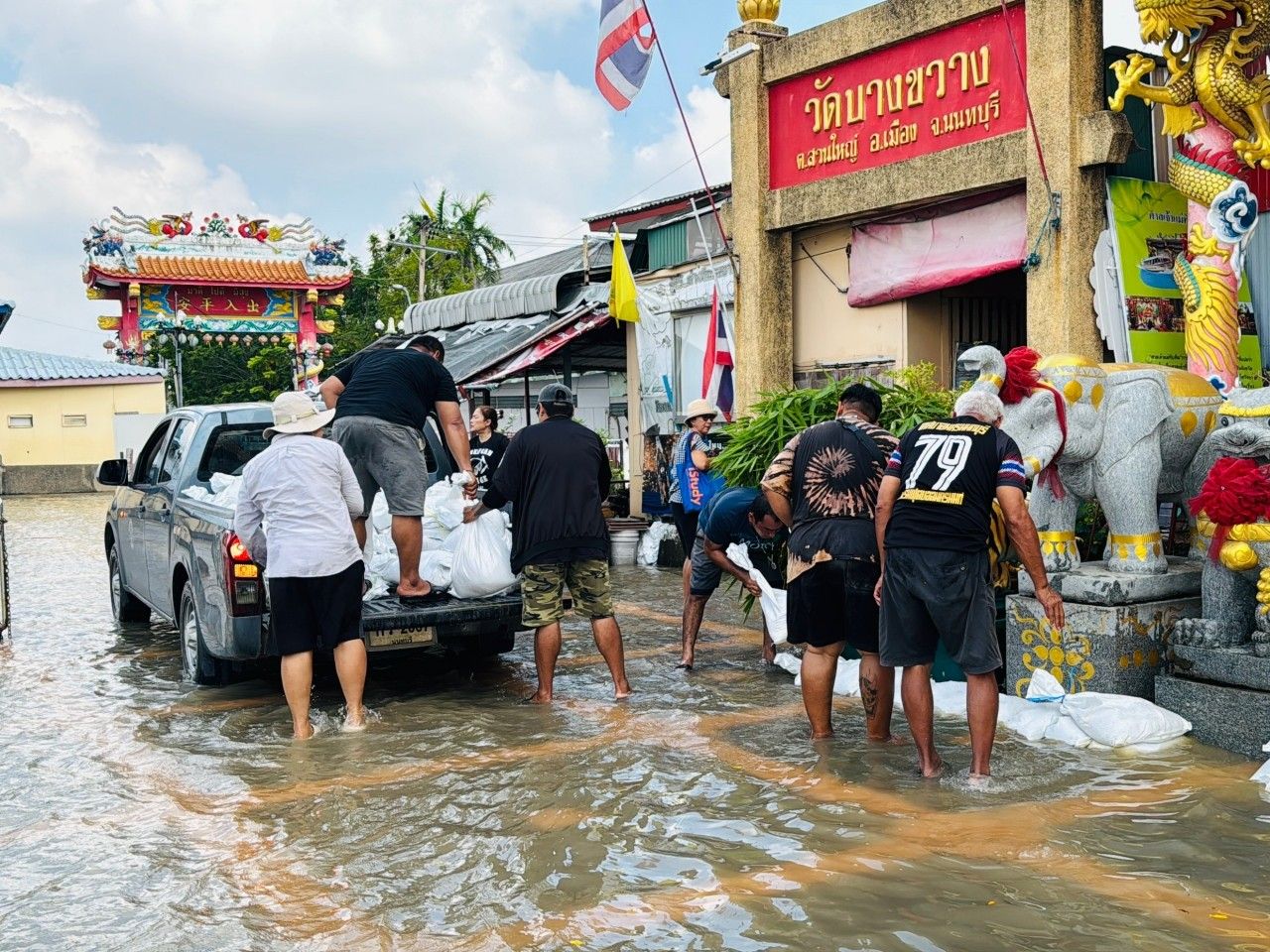 เจ้าหน้าที่เทศบาลนครนนทบุรี ระดมเจ้าหน้าที่ลงพื้นที่พบแนวกระสอบทรายเดิมถูกน้ำดันจนกระสอบทรายล้ม จุดที่ 1. บริเวณทางเข้าวัดบางขวาง ใกล้ศาลเจ้าแม่ทับทิม 2.หน้าไปรษณีย์ไทย สาขาสวนใหญ่ ท่าน้ำนนทบุรี 3. หน้าสโมสรจังหวัดนนทบุรี เจ้าหน้าที่เทศบาลนครนนทบุรี เร่งนำกระสอบทรายเข้าซ่อมเสริมแนวเดิมให้แข็งแรงพร้อมกับเพิ่มระดับแนวกระสอบทรายให้สูงขึ้นจึงสามารถควบคุมน้ำไม่ให้ไหลเข้าชุมชนได้