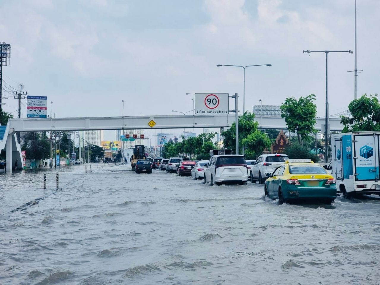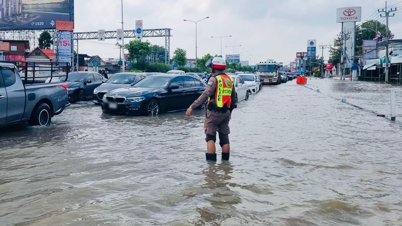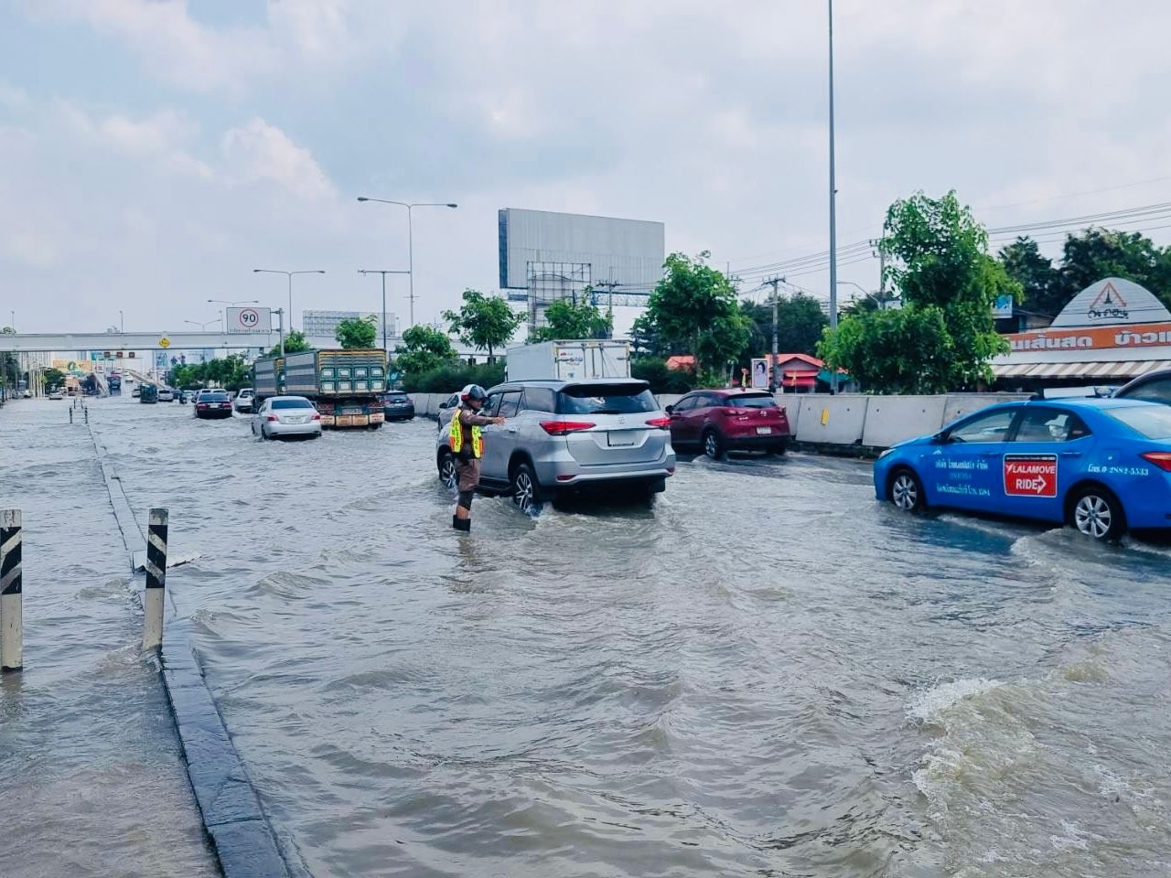ส.ต.อ.วัชรพงษ์ คำมัน เจ้าหน้าที่ตำรวจจราจร สภ.บางศรีเมือง จ.นนทบุรี กล่าวว่า ระดับน้ำเริ่มเอ่อล้นขึ้นมาตามท่อระบายน้ำบนถนนตั้งแต่ช่วง 10 โมงเช้าของวันนี้ จนท่วมเต็มผิวการจราจรในช่องทางคู่ขนานทำให้รถยนต์สัญจรผ่านไปมาไม่ได้ต้องปิดถนนช่องทางคู่ขนานซึ่งใช้เป็นจุดกลับรถใต้สะพาน เนื่องจากน้ำท่วมสูง รถยนต์ไม่ควรวิ่งผ่านเพราะเริ่มมีรถดับหลายคัน ส่วนรถไฟฟ้าต้องเพิ่มความระมัดระวังเป็นพิเศษ ควรใช้ช่องทางหลักแทน