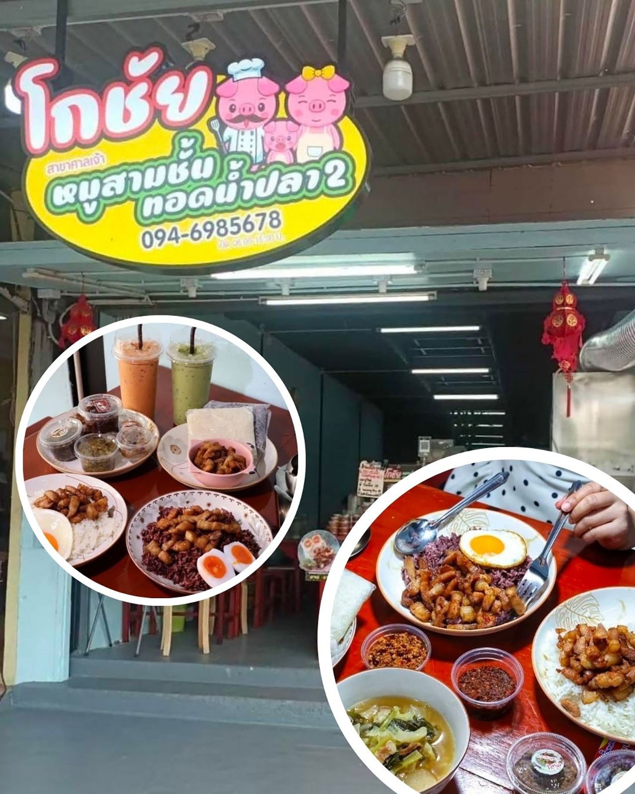 “โกชัยหมูสามชั้นทอดน้ำปลา” ร้านอาหารพื้นบ้านในตลาดศาลเจ้าสุราษฎร์ธานี ที่ขึ้นชื่อเรื่องเมนู หมูสามชั้นทอดน้ำปลา กรอบนอกนุ่มใน รสเข้มข้น หอมกลิ่นน้ำปลาชั้นดี กินกับข้าวสวยร้อน ๆ เข้ากันสุด ๆ เปิดขายตั้งแต่เช้าตรู่ เสิร์ฟอาหารจานด่วนรสจัดจ้านแบบใต้แท้ ๆ ที่ทั้งอร่อยและอิ่มคุ้ม เมนูยอดนิยมได้แก่ ข้าวราดหมูสามชั้นทอดน้ำปลา + ไข่ดาว, ข้าวราดหมูสามชั้นล้วน, และ ต้มจืดหมูสับเต้าหู้ ให้เลือกเติมความอร่อยกันได้ตามใจ ตอนนี้สั่งง่ายผ่าน LINE MAN ได้เลย แถมยังร่วมโครงการ “คนละครึ่งพลัส” ให้คุณอิ่มอร่อยครึ่งราคาแบบสุดคุ้มอีกด้วย!