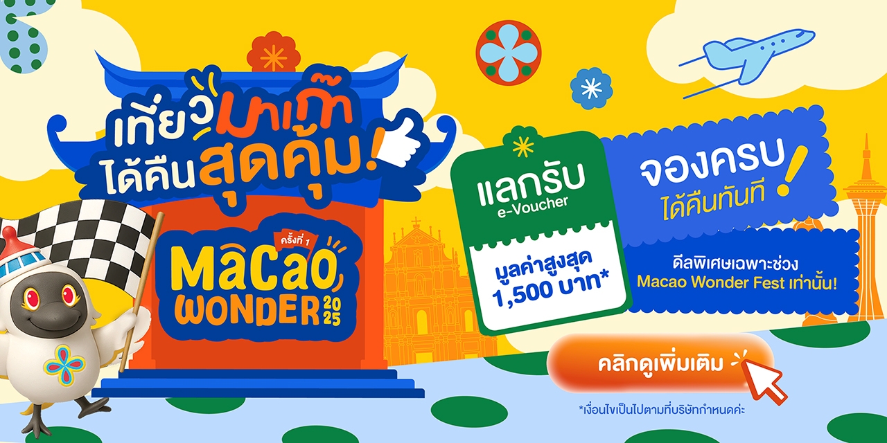พิเศษ! เมื่อจองและชำระภายในวันที่ 1–15 พฤศจิกายน 2568 และเดินทางภายในวันที่ 31 มกราคม 2569 รับ e-Voucher มูลค่าสูงสุดถึง 1,500 บาท* สามารถลงทะเบียนรับสิทธิ์ได้ที่ www.macaotourismth.com จำนวนจำกัด 200 รางวัล (เงื่อนไขเป็นไปตามที่บริษัทฯ กำหนด)