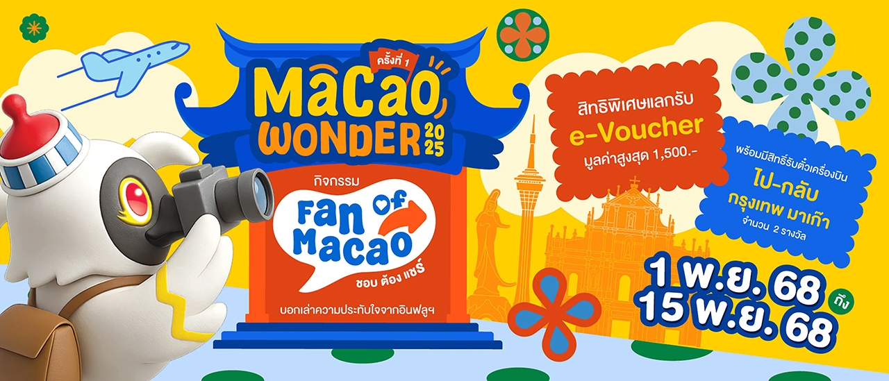 ครั้งแรก! การท่องเที่ยวมาเก๊าจัด แคมเปญท่องเที่ยวออนไลน์สุดยิ่งใหญ่จากมาเก๊า (Online Travel Fair) กับ “Macao Wonder Fest 2025” ที่รวบรวมดีลและโปรโมชันสุดพิเศษจากพันธมิตรท่องเที่ยวชั้นนำของไทย อาทิ สายการบิน Air Macau, Thai Lion Air, AirAsia, ผู้ให้บริการด้านการเงินและแพลตฟอร์มการจอง TrueMoney, Klook, KTC, และ บริษัททัวร์ชั้นนำอย่าง DhakulChan, Mileage Air & Travel และ BokBoon Delivery มอบความครบครันให้นักท่องเที่ยวสามารถเลือกจองทั้งตั๋วเครื่องบิน โรงแรม แพ็กเกจทัวร์และกิจกรรมเที่ยวในมาเก๊า ได้ในราคาสุดพิเศษ ตลอด 15 วันของการจัดงาน ผ่านช่องทางหน้าเว็บไซต์ www.macaotourismth.com และพันธมิตรที่ร่วมรายการ