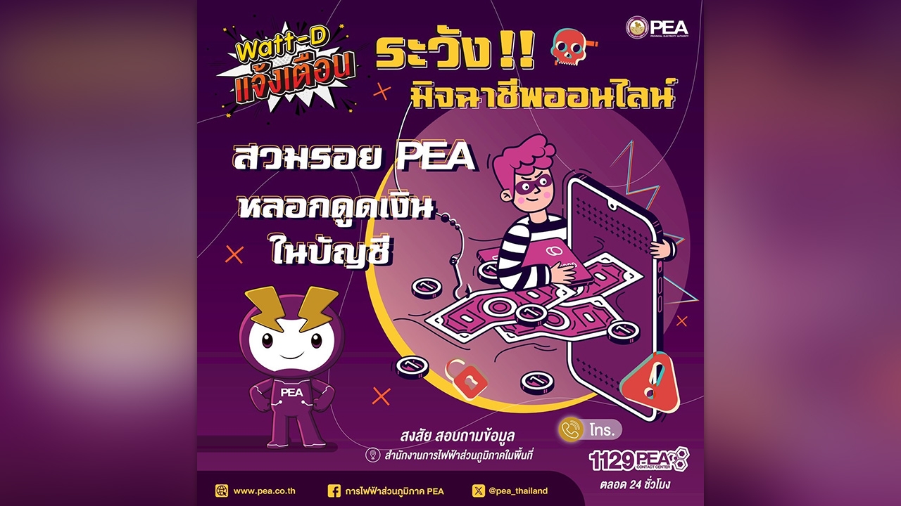 การไฟฟ้าส่วนภูมิภาค (PEA) แจ้งเตือนประชาชนให้ระมัดระวังมิจฉาชีพออนไลน์ที่แอบอ้างชื่อหรือโลโก้ของ PEA เพื่อหลอกลวงให้โอนเงิน หรือหลอกขอข้อมูลส่วนตัวทางออนไลน์ อาจนำไปสู่การถูกดูดเงินออกจากบัญชีธนาคาร
