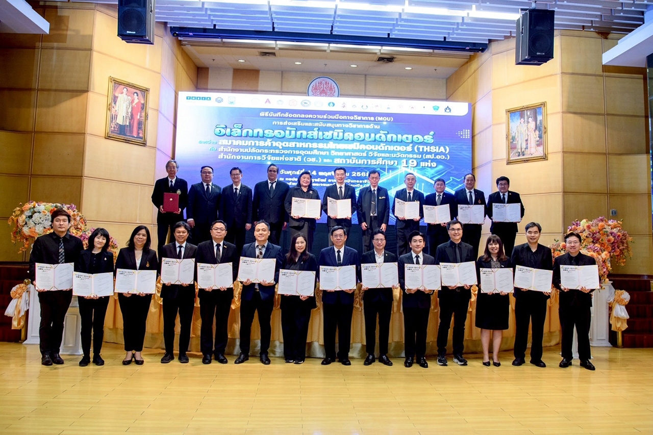 ในโอกาสเดียวกัน ยังได้มีพิธีลงนามบันทึกข้อตกลงความร่วมมือทางวิชาการ (MOU) ระหว่างสมาคมการค้าอุตสาหกรรมไทยเซมิคอนดักเตอร์ (Thai Semiconductor Industry Trade Association: THSIA) กับสำนักงานปลัดกระทรวงการอุดมศึกษา วิทยาศาสตร์ วิจัยและนวัตกรรม สำนักงานการวิจัยแห่งชาติ (วช.) และ 19 มหาวิทยาลัยเครือข่ายทั่วประเทศ โดยมี ศ.ดร.ศุภชัย ปทุมนากุล ปลัดกระทรวง อว. เป็นประธานในพิธี ภายในงานได้รับเกียรติจาก ดร.พันธุ์เพิ่มศักดิ์ อารุณี ผู้ช่วยปลัดกระทรวง อว. ศ.ดร.ธีรวุฒิ บุณยโสภณ นายกสภามหาวิทยาลัยเทคโนโลยีพระจอมเกล้าพระนครเหนือ ศ.ดร.ธานินทร์ ศิลป์จารุ อธิการบดี มจพ. คุณวิรัตน์ ศรีอมรกิจกุล นายกสมาคมการค้าอุตสาหกรรมไทยเซมิคอนดักเตอร์ พร้อมด้วยผู้บริหารระดับสูงจากหน่วยงานภาครัฐ ภาคการศึกษา และภาคอุตสาหกรรม เข้าร่วมในพิธีอย่างพร้อมเพรียง ทั้งนี้ มจพ. ได้รับมอบหมายจากกระทรวงการอุดมศึกษา วิทยาศาสตร์ วิจัยและนวัตกรรม ให้ทำหน้าที่เป็นศูนย์พัฒนากำลังคนด้านเซมิคอนดักเตอร์และแผ่นวงจรพิมพ์ (Printed Circuit Board: PCB) เพื่อยกระดับศักยภาพของบุคลากรและสร้างระบบนิเวศ (Ecosystem) ที่ครบวงจรในการพัฒนาอุตสาหกรรมเซมิคอนดักเตอร์ของประเทศไทย นอกจากนี้ มจพ. ยังเป็นที่ตั้งของสมาคมการค้าอุตสาหกรรมไทยเซมิคอนดักเตอร์ (THSIA) ซึ่งมีบทบาทสำคัญในการเป็นศูนย์กลางบูรณาการความร่วมมือระหว่างภาคการศึกษาและภาคอุตสาหกรรม ครอบคลุมทั้งด้านวิชาการ การวิจัย และการถ่ายทอดเทคโนโลยี เพื่อเสริมสร้างความเข้มแข็งของอุตสาหกรรมด้านเซมิคอนดักเตอร์ให้สามารถแข่งขันได้ในระดับภูมิภาค