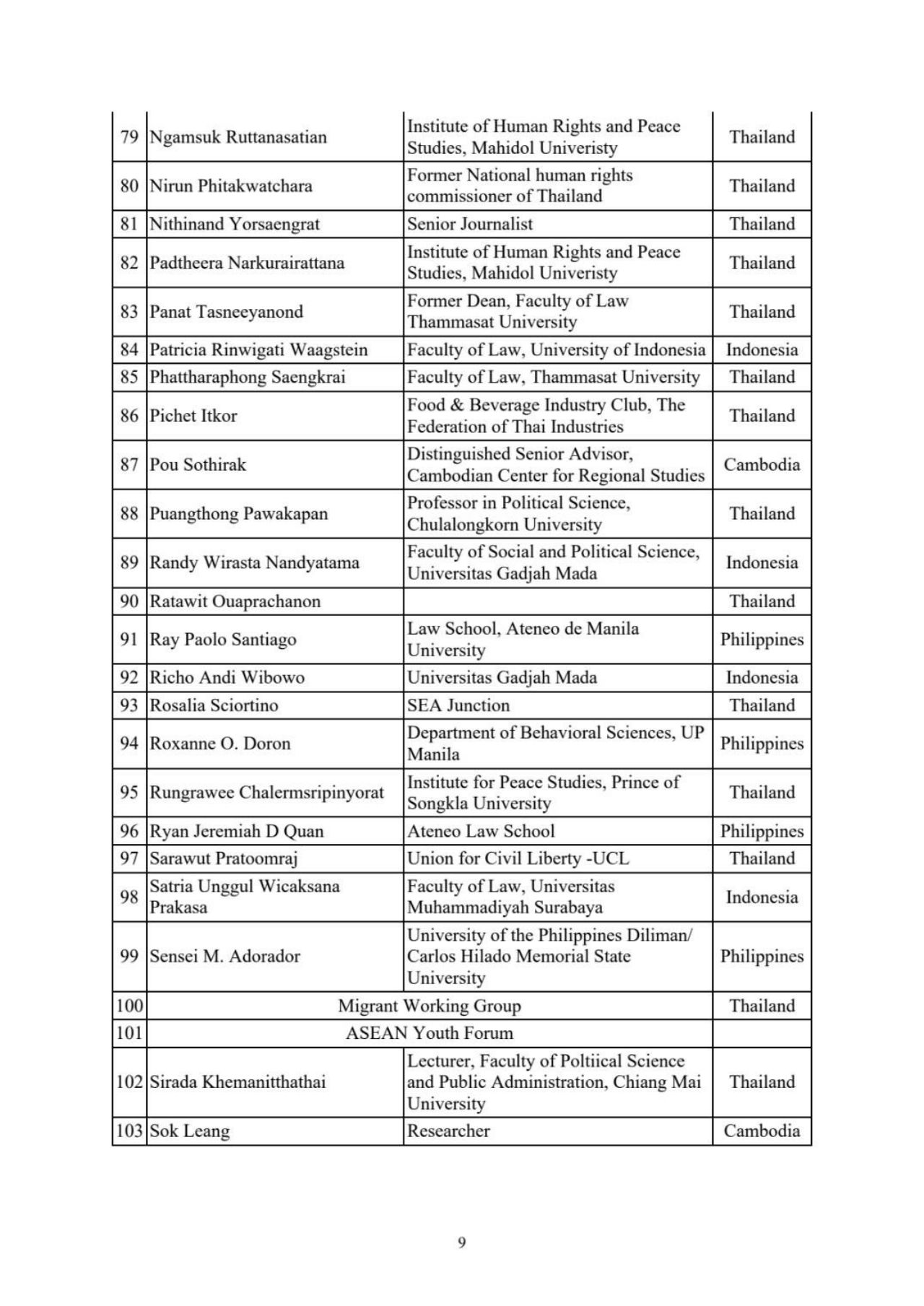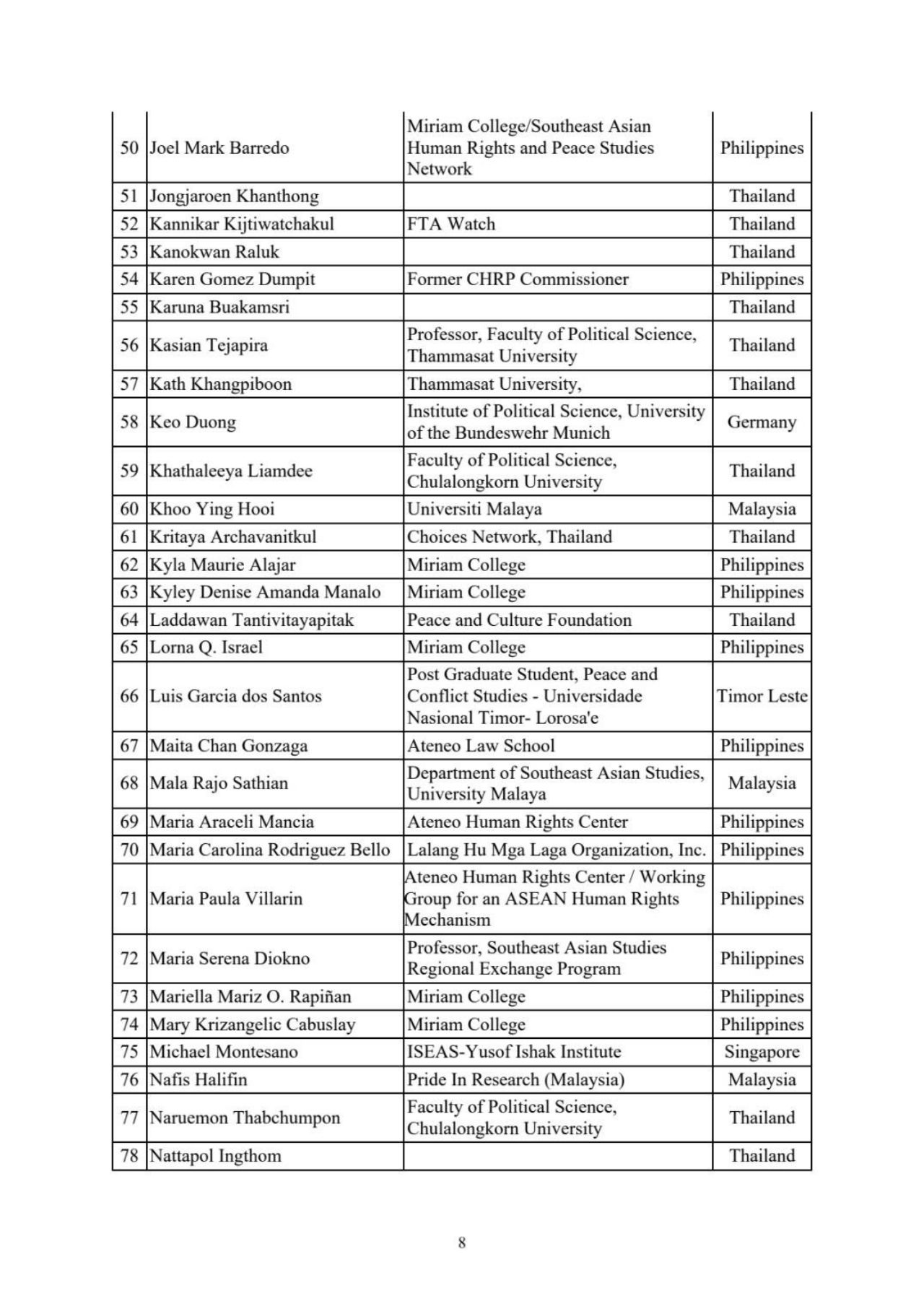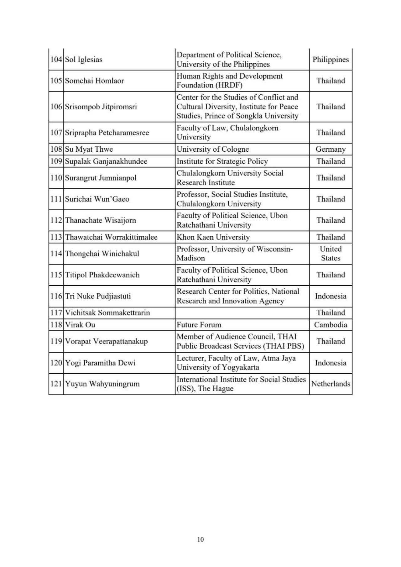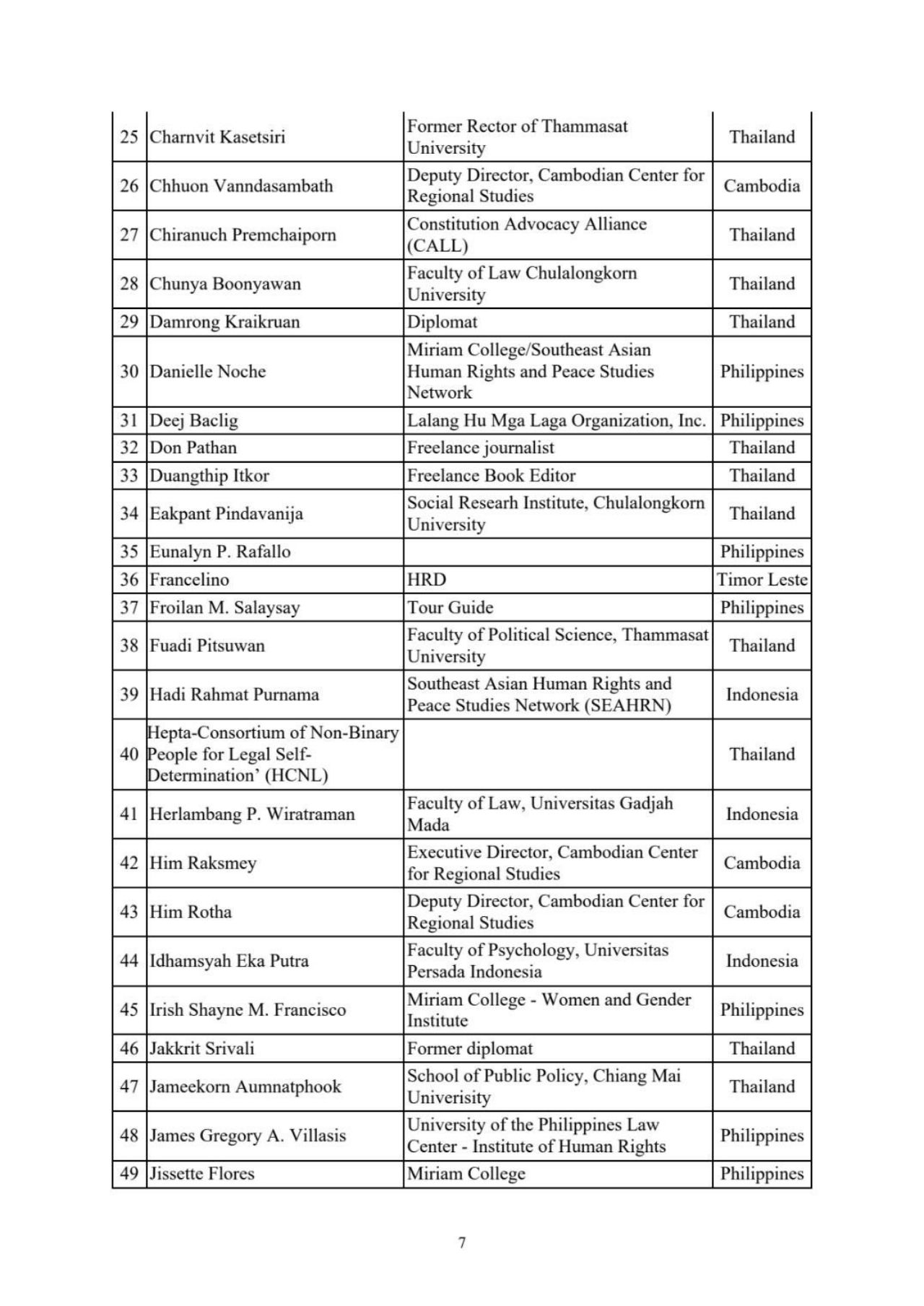 เราผู้มีรายนามดังต่อไปนี้ จึงขอเรียกร้องให้รัฐบาลของทั้งสองประเทศดำเนินการด้วยความกล้าหาญทางจริยธรรมและยึดมั่นในความร่วมมือระหว่างกัน และเรียกร้องให้อาเซียนแสดงบทบาทนำอย่างสุจริตและแน่วแน่ ในฐานะผู้มีส่วนได้เสียในเอเชียตะวันออกเฉียงใต้ เราพร้อมยืนหยัดสนับสนุนความริเริ่มใด ๆ ในการสร้างสันติภาพที่เป็นธรรมและยั่งยืน