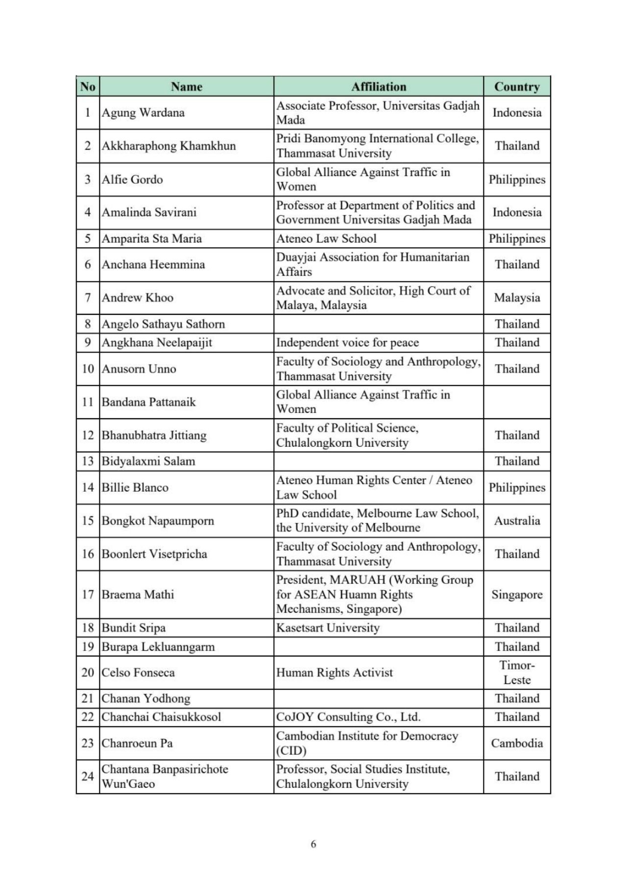 1.3 เราขอให้ประธานอาเซียนแสดงบทบาทที่แข็งขัน เป็นกลาง และคงเส้นคงวา และเรียกร้องด้วยความเคารพให้ประธานอาเซียนและคณะผู้สังเกตการณ์อาเซียน (ASEAN Observer Team หรือ AOT) ปฏิบัติภารกิจของตนด้วยความเป็นมืออาชีพ ความถูกต้อง และความโปร่งใสอย่างเต็มที่ ทั้งนี้ ข้อผิดพลาดใด ๆ อาทิ ข้อบกพร่องในการสื่อสารและการเปิดเผยข้อมูลสำคัญของการดำเนินงานของคณะผู้สังเกตการณ์โดยไม่ระมัดระวังจะต้องไม่เกิดซ้ำอีก