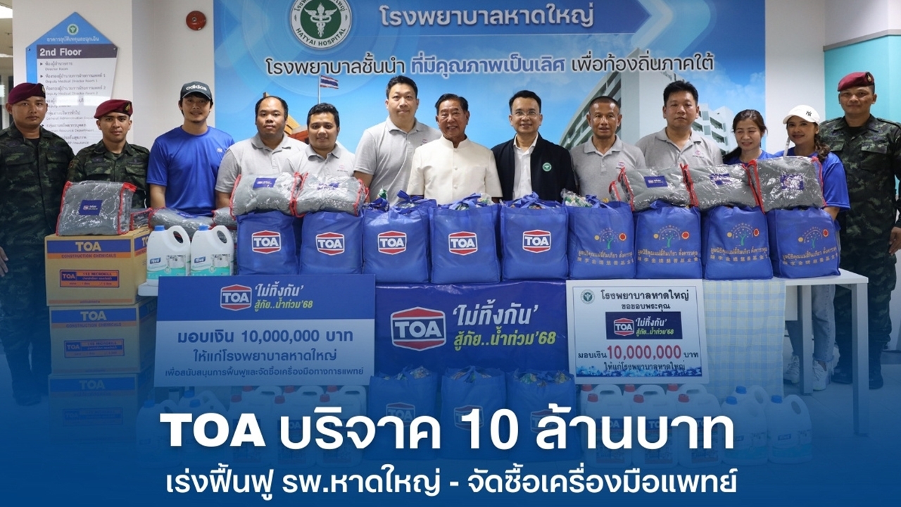 TOA ตระหนักถึงความสำคัญดังกล่าว จึงพร้อมเป็นส่วนหนึ่งในการเร่งฟื้นฟูอย่างเร่งด่วน บริจาคเงิน 10 ล้านบาท เพื่อใช้ในการฟื้นฟูซ่อมแซมโรงพยาบาลหาดใหญ่ และจัดซื้อครุภัณฑ์เครื่องมือทางการแพทย์ที่เสียหายจากอุทกภัย เพื่อให้โรงพยาบาลกลับมาเปิดบริการประชาชน และช่วยเหลือผู้ป่วยได้เต็มศักยภาพโดยเร็วที่สุดภายใน 2 เดือน ตามแผนของกระทรวงสาธารณสุข พร้อมมอบสิ่งของจำเป็นแก่โรงพยาบาลรวมมูลค่าอีก 1,350,000 บาท อาทิ น้ำยาทำความสะอาดและกำจัดเชื้อโรคทีโพล์ สเปรย์กำจัดแมลงเชนไดร้ท์ และน้ำดื่ม ฮอกไกโด เพื่อสนับสนุนการปฏิบัติงานของบุคลากรทางการแพทย์ ให้กลับมาเป็นเสาหลักด้านสุขภาพของพี่น้องชาวใต้ได้อีกครั้ง