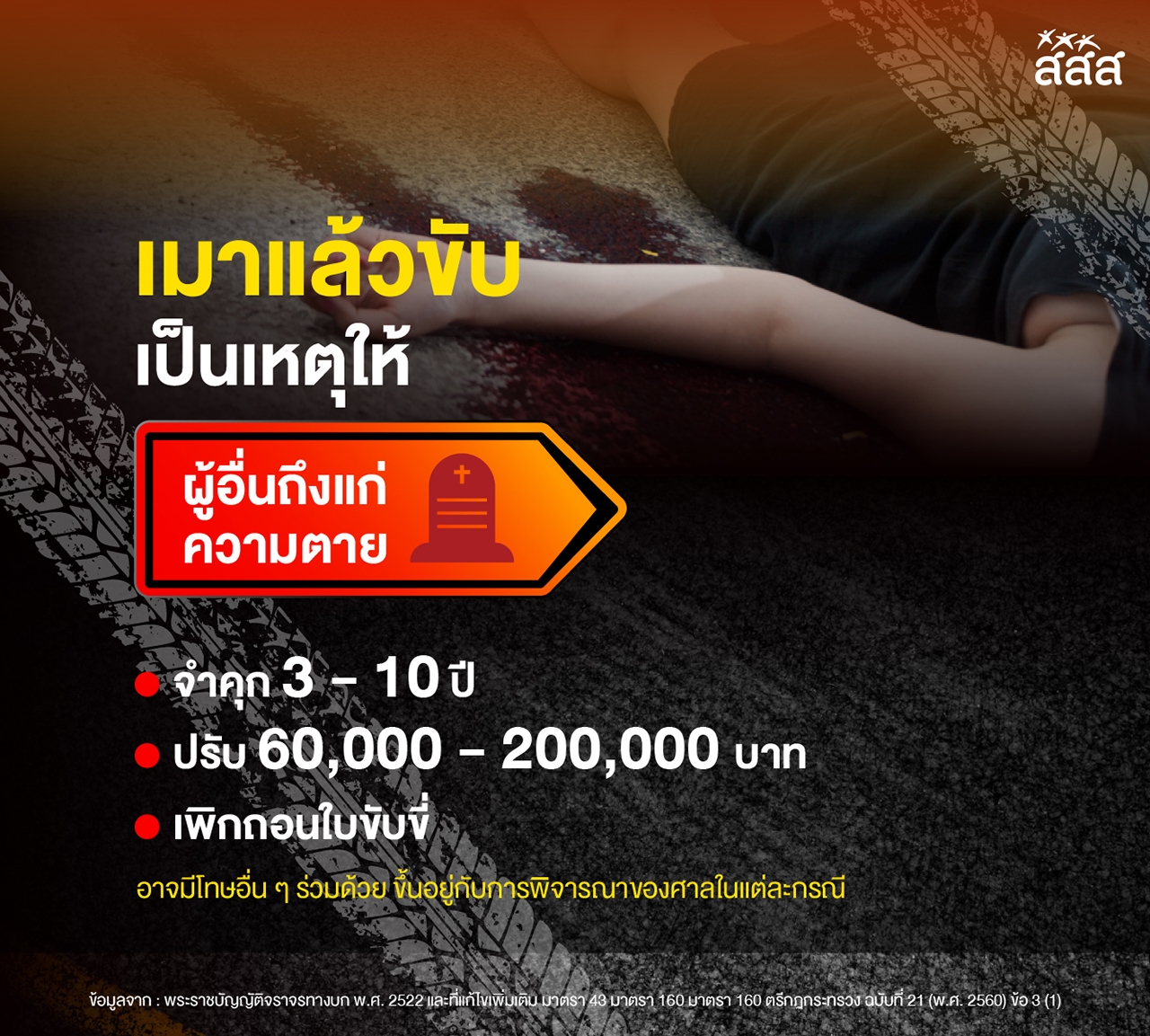 การดื่มแล้วขับไม่ใช่แค่ความผิด แต่คือการทำลายชีวิตตัวเองและผู้อื่น จากวินาทีที่คุณปิดประตูรถหลังดื่มแอลกอฮอล์ คุณกำลังเปิดประตูคุกและเปิดประตูนรกให้กับตัวเองและคนที่คุณรัก แม้ไม่ชนใคร แค่เจอด่านเป่าก็ต้องขึ้นศาล เสียค่าปรับหลักหมื่นถึงแสน คุมประพฤติ บำเพ็ญประโยชน์ และพักใบขับขี่ หากชนคนบาดเจ็บหรือเสียชีวิต โทษจำคุกสูงสุด 10 ปี ค่าชดเชยหลักล้าน และประวัติอาชญากรรมติดตัวตลอดชีวิต การตัดสินใจเพียงครั้งเดียวสามารถทำลายชีวิตได้ตลอดกาล อย่าปล่อยให้การดื่มแล้วขับพรากอนาคตของคุณและคนที่คุณรัก