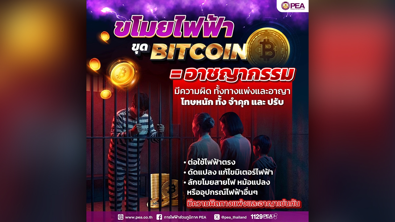 การไฟฟ้าส่วนภูมิภาค (PEA) ขอเตือนการลักลอบใช้ไฟฟ้า ขุดเหรียญบิตคอยน์ ดัดแปลงแก้ไขอุปกรณ์และมิเตอร์ไฟฟ้า อันตรายถึงชีวิต กระทบต่อความมั่นคงทางระบบไฟฟ้าของประเทศ หากพบดำเนินคดีทั้งทางแพ่งและทางอาญา