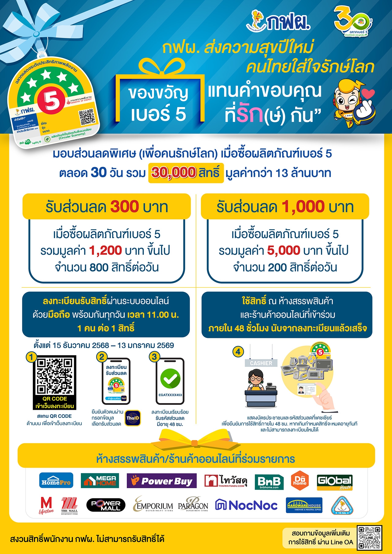 แคมเปญ “ของขวัญเบอร์ 5 แทนคำขอบคุณที่รัก(ษ์)กัน” เป็นการมอบส่วนลดเมื่อซื้อผลิตภัณฑ์เบอร์ 5 วันละ 1,000 สิทธิ์ เป็นเวลา 30 วัน แบ่งเป็น ส่วนลด 300 บาท เมื่อซื้อผลิตภัณฑ์เบอร์ 5 ตั้งแต่ 1,200 บาทขึ้นไป วันละ 800 สิทธิ์ และส่วนลด 1,000 บาท เมื่อซื้อผลิตภัณฑ์เบอร์ 5 ตั้งแต่ 5,000 บาทขึ้นไป วันละ 200 สิทธิ์ โดยเปิดให้ผู้ที่สนใจลงทะเบียนรับสิทธิ์ผ่านระบบออนไลน์ด้วยมือถือพร้อมกันทุกวัน เวลา 11.00 น. ตั้งแต่วันที่ 15 ธันวาคม 2568 ถึง 15 มกราคม 2569 จำกัด 1 คนต่อ 1 สิทธิ์ และต้องใช้สิทธิ์ภายใน 48 ชั่วโมง หากเกินกำหนดสิทธิ์จะหมดอายุทันที โดยสิทธิ์ที่ถูกยกเลิกหรือหากมีสิทธิ์ที่เหลือในแต่ละวันจะถูกนำไปสมทบในวันเสาร์และอาทิตย์แทน