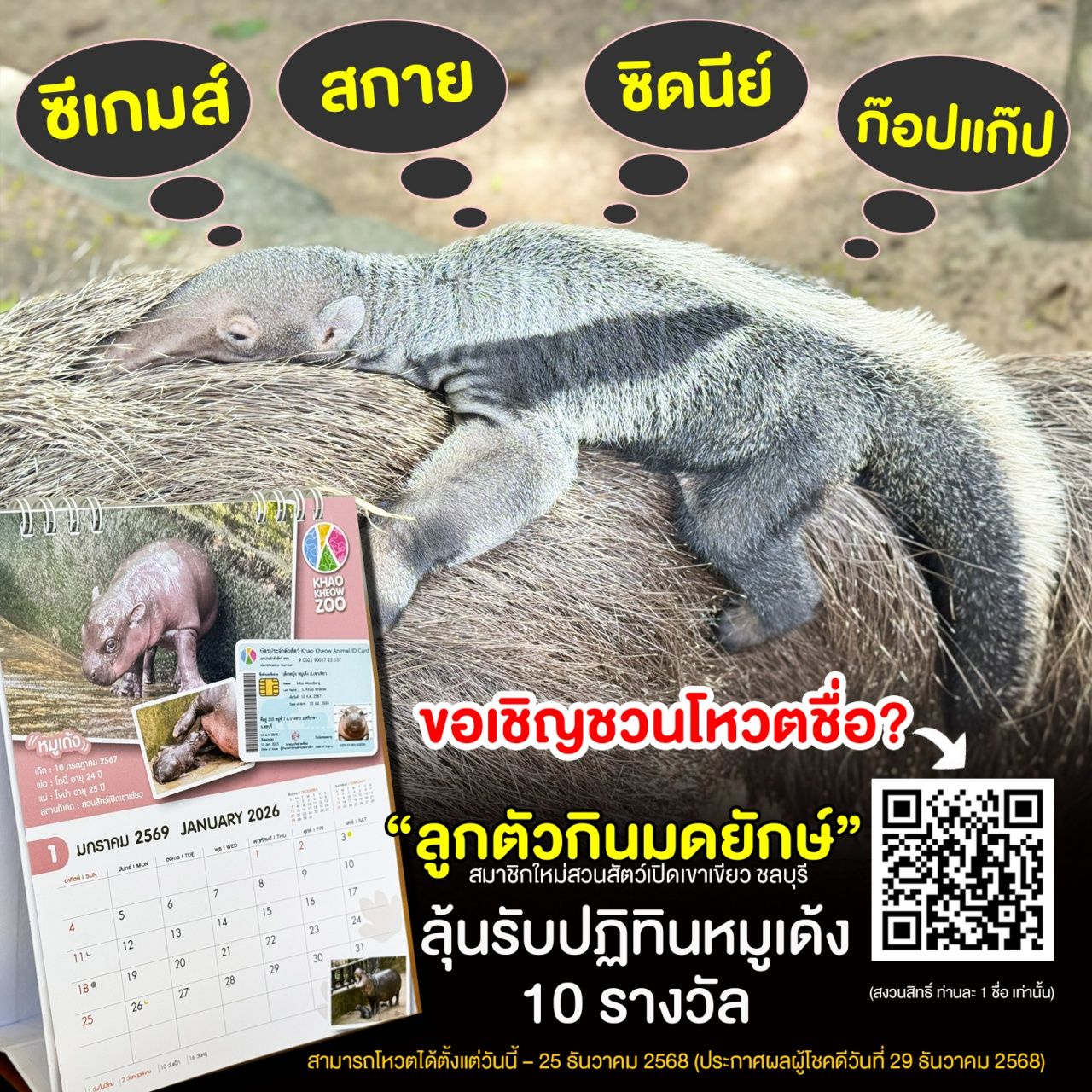 สวนสัตว์เปิดเขาเขียวจึงเชิญชวนนักเที่ยวและประชาชนทั่วไปเข้าร่วมกิจกรรมโหวตเลือกชื่อ “ลูกตัวกินมดยักษ์” คือ ซีเกมส์ สกาย ซิดนีย์ ก๊อปแก๊ป ลุ้นรับปฏิทินตั้งโต๊ะหมูเด้ง จำนวน 10 รางวัล โดยสามารถร่วมโหวตตั้งชื่อ “ลูกตัวกินมดยักษ์” ผ่านช่องทางลิงค์ https://forms.gle/9AKYpqc61P9kuVTc8 ได้ตั้งแต่วันนี้ - 25 ธันวาคม 2568 เวลา 16.30 น.