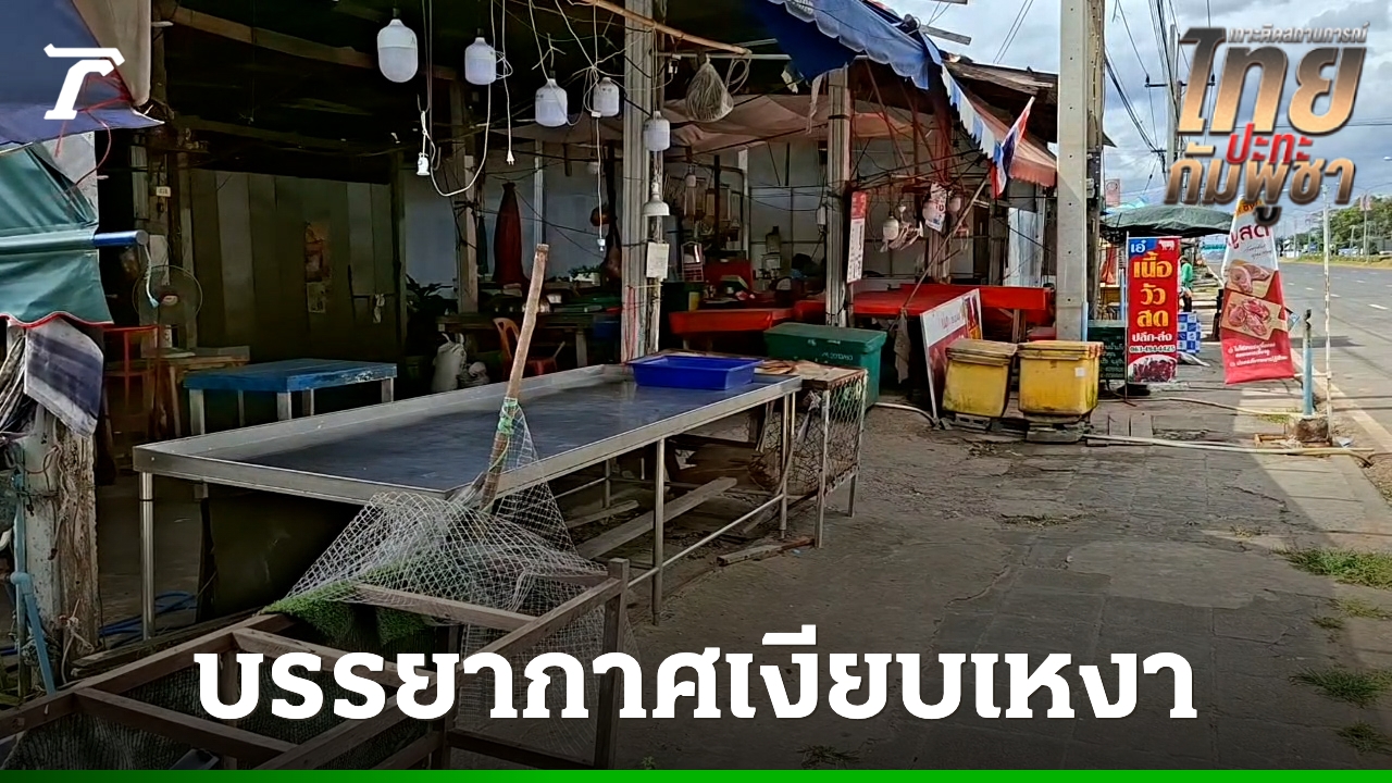 ขณะที่บรรยากาศในพื้นที่ชายแดนด้าน จ.สุรินทร์ เป็นไปอย่างเงียบเหงา โดยเฉพาะบริเวณถนนย่านตลาดการค้าชายแดนช่องจอม ต.ด่าน อ.กาบเชิงฯ ที่ร้านค้าถูกปิดเงียบเป็นวันที่ 12 ของการสู้รบ