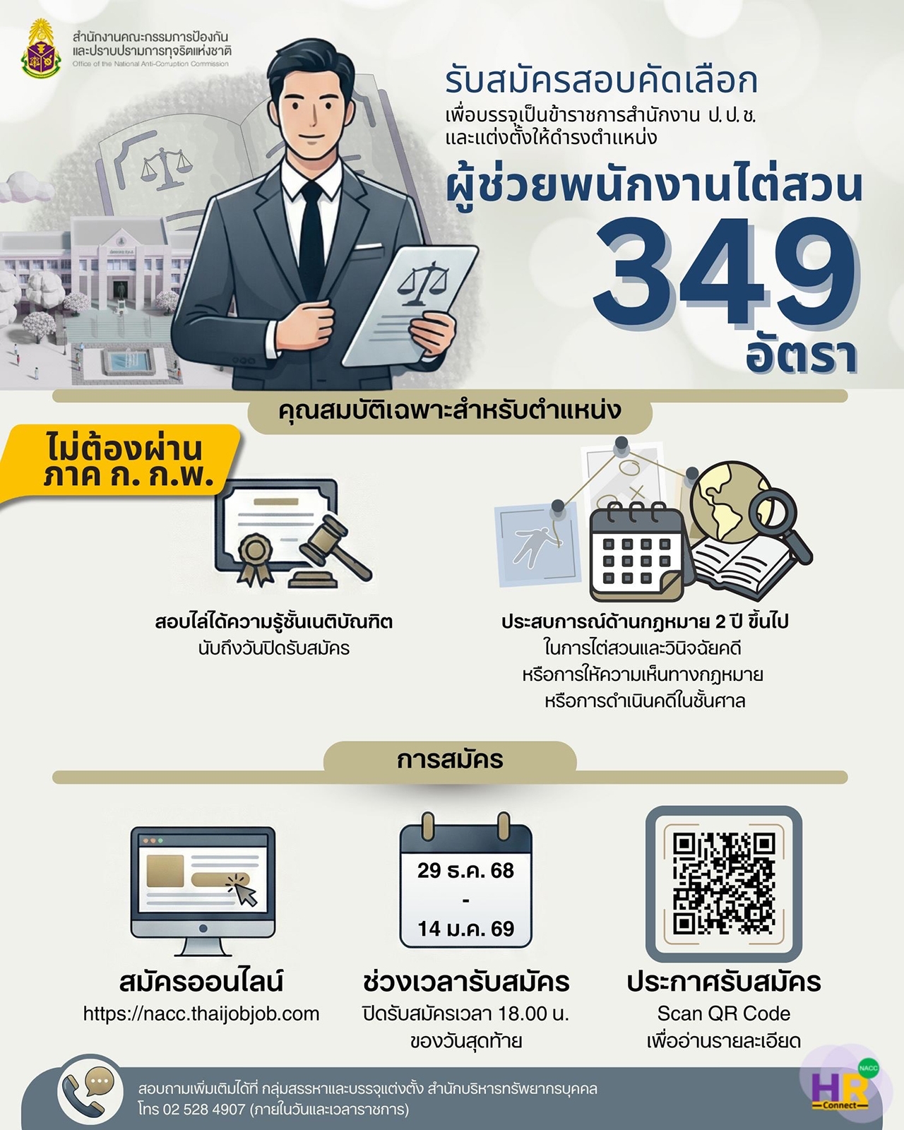 ทั้งนี้ ผู้ประสงค์จะสมัครสอบ สมัครได้ทางเว็บไซต์ http://www.nacc.go.th เมนูบริการอิเล็กทรอนิกส์ หัวข้อระบบรับสมัครสอบ Online หรือ https://nacc.thaijobjob.com ตั้งแต่วันที่ 29 ธันวาคม 2568 เวลา 00.00 น. ถึงวันที่ 14 มกราคม 2569 เวลา 18.00 น. โดยสามารถดูรายละเอียดเพิ่มเติมได้ที่ http://www.nacc.go.th หัวข้อประกาศสรรหาเจ้าหน้าที่