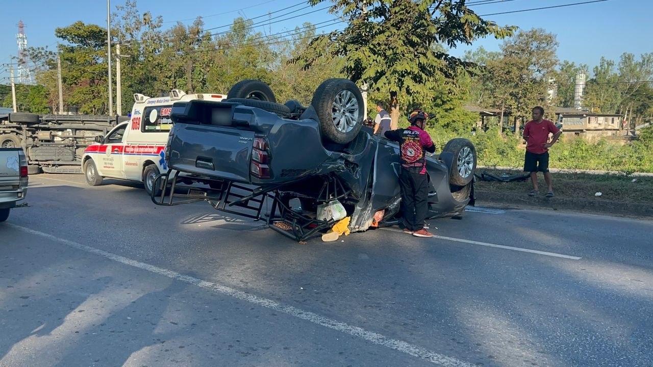 ที่เกิดเหตุพบรถยนต์กระบะ อีซูซุ แคป ทะเบียน แพร่ ติดโรลบาร์รอบคัน ล้อชี้ฟ้า ขวางถนนอยู่ในเลนขาเข้าเมืองน่าน สภาพรถพังเสียหายทั้งคัน ส่วนรถคู่กรณีเป็นรถกระบะ โตโยต้า รีโว้ 4 ประตู ทะเบียน กรุงเทพมหานคร พลิกตะแคงอยู่ในเลนขาเข้าเมืองน่านเช่นกัน สภาพเสียหายทั้งคัน