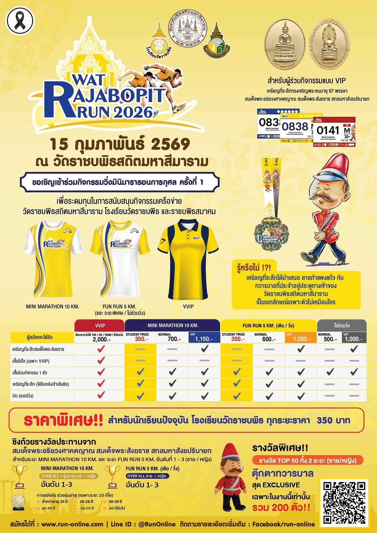 - ค่าสมัคร 500 บาท (ได้เสื้อ) / VIP 1,000 บาท (ได้เสื้อ+เหรียญสมเด็จฯ)
