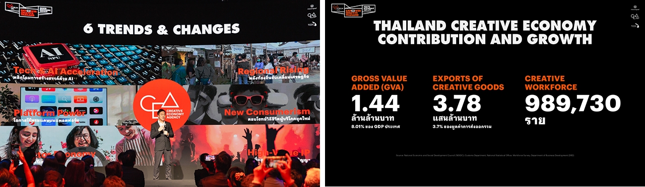ดร. ชาคริต พิชญางกูร ผู้อำนวยการสำนักงานส่งเสริมเศรษฐกิจสร้างสรรค์ ขึ้นกล่าวในช่วง Creative Economy Strategic Direction 2026 ขยายภาพความสำคัญของอุตสาหกรรมสร้างสรรค์ไทย โดยระบุว่าปัจจุบันมูลค่าของอุตสาหกรรมสร้างสรรค์ไทย (GVA) นั้นสูงถึง 1.44 ล้านล้านบาท คิดเป็นสัดส่วน 8.01% ของผลิตภัณฑ์มวลรวมประเทศ (GDP) และเป็นอุตสาหกรรมที่มีความสามารถในการฟื้นตัวได้เร็วกว่าและสูงกว่าภาพรวมเศรษฐกิจเมื่อเกิดวิกฤต ทั้งยังช่วยสร้างมูลค่าการส่งออกได้ถึง 3.91 แสนล้านบาท และสร้างตำแหน่งงานให้ประเทศโดยมีผู้ประกอบอาชีพนักสร้างสรรค์อยู่ถึง 9.8 แสนคนในไทย ดังนั้น อุตสาหกรรมสร้างสรรค์จึงไม่ใช่อุตสาหกรรมเสริม แต่เป็นกลไกขับเคลื่อนเศรษฐกิจที่ควรได้รับการสนับสนุน