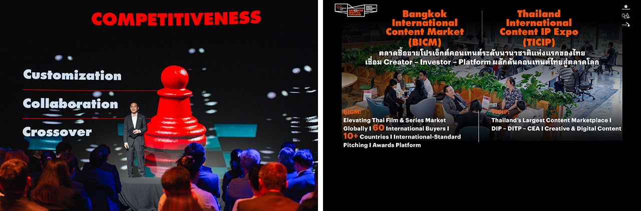 นายอินทพันธุ์ บัวเขียว รองผู้อำนวยการสำนักงานส่งเสริมเศรษฐกิจสร้างสรรค์ ขึ้นกล่าวต่อในช่วง Creative Industry Development นำเสนอแผนการเพิ่มขีดความสามารถการแข่งขันให้อุตสาหกรรมสร้างสรรค์ไทย ทั้งในกลุ่มคอนเทนต์ ดนตรี โฆษณา สถาปัตยกรรม การออกแบบ และสินค้าและบริการสร้างสรรค์ โดยปีนี้ยังคงโฟกัสที่คอนเทนต์ (ภาพยนตร์ ซีรีส์ และแอนิเมชัน) และดนตรีอย่างต่อเนื่อง เช่น โครงการ Content Lab 2026 ที่จัดขึ้นต่อเนื่องเป็นปีที่ 4 เพื่อพัฒนาทักษะและยกระดับศักยภาพโปรเจ็กต์ของนักสร้างสรรค์สายภาพยนตร์ ซีรีส์ และแอนิเมชัน พร้อมกันนี้ CEA ยังร่วมจัดงาน “Thailand International Content IP Expo (TICIP)” กับกรมทรัพย์สินทางปัญญา (DIP) และกรมส่งเสริมการค้าระหว่างประเทศ (DITP) เพื่อเปิดตลาดซื้อขายโปรเจ็กต์คอนเทนต์ระดับนานาชาติ และสร้างตลาดซื้อขาย IP คอนเทนต์ที่ใหญ่ที่สุดในไทย ช่วงเดือนกรกฎาคม 2569