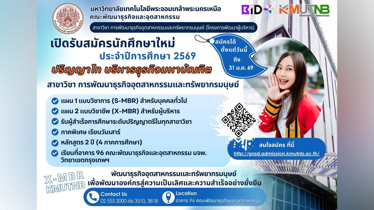 เปิดรับสมัครนักศึกษาปริญญาโท หลักสูตรบริหารธุรกิจมหาบัณฑิต (MBA) สาขาวิชาการพัฒนาธุรกิจอุตสาหกรรมและทรัพยากรมนุษย์ (S-MBR & X-MBR) คณะพัฒนาธุรกิจและอุตสาหกรรมมหาวิทยาลัยเทคโนโลยีพระจอมเกล้าพระนครเหนือ