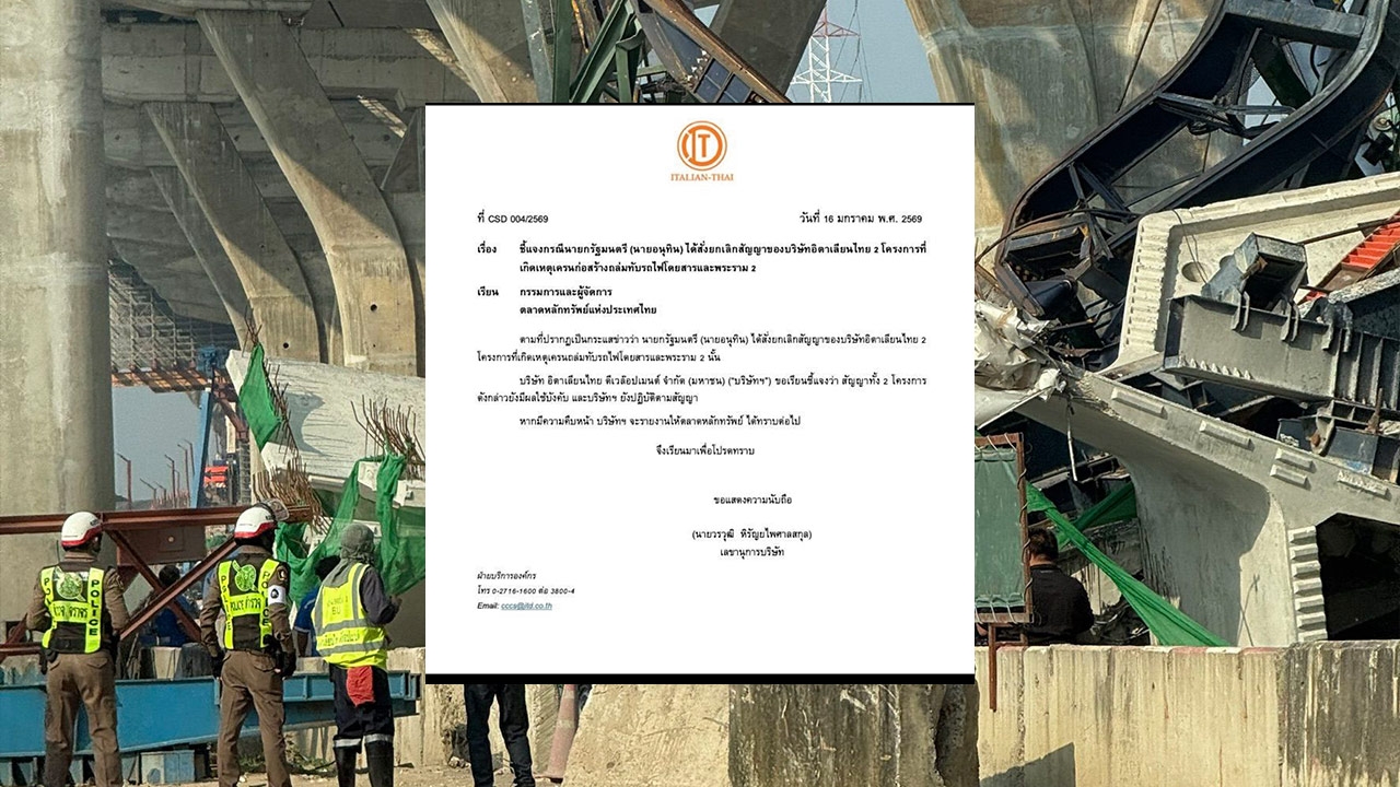 เมื่อวันที่ 16 มกราคม 2569 ผู้สื่อข่าวรายงานว่า ฝ่ายบริการองค์กร บริษัท อิตาเลียนไทย ดีเวลลอปเมนต์ จำกัด (มหาชน) ได้ทำเอกสาร ชี้แจงตลาดหลักทรัพย์แห่งประเทศไทย ใจความระบุว่า ตามที่ปรากฏเป็นกระแสข่าวว่านายกรัฐมนตรี (นายอนุทิน ชาญวีรกูล) ได้สั่งยกเลิกสัญญาของบริษัท อิตาเลียนไทย 2 โครงการที่เกิดเหตุเครนถล่มทับรถไฟโดยสารและพระราม 2 นั้น
