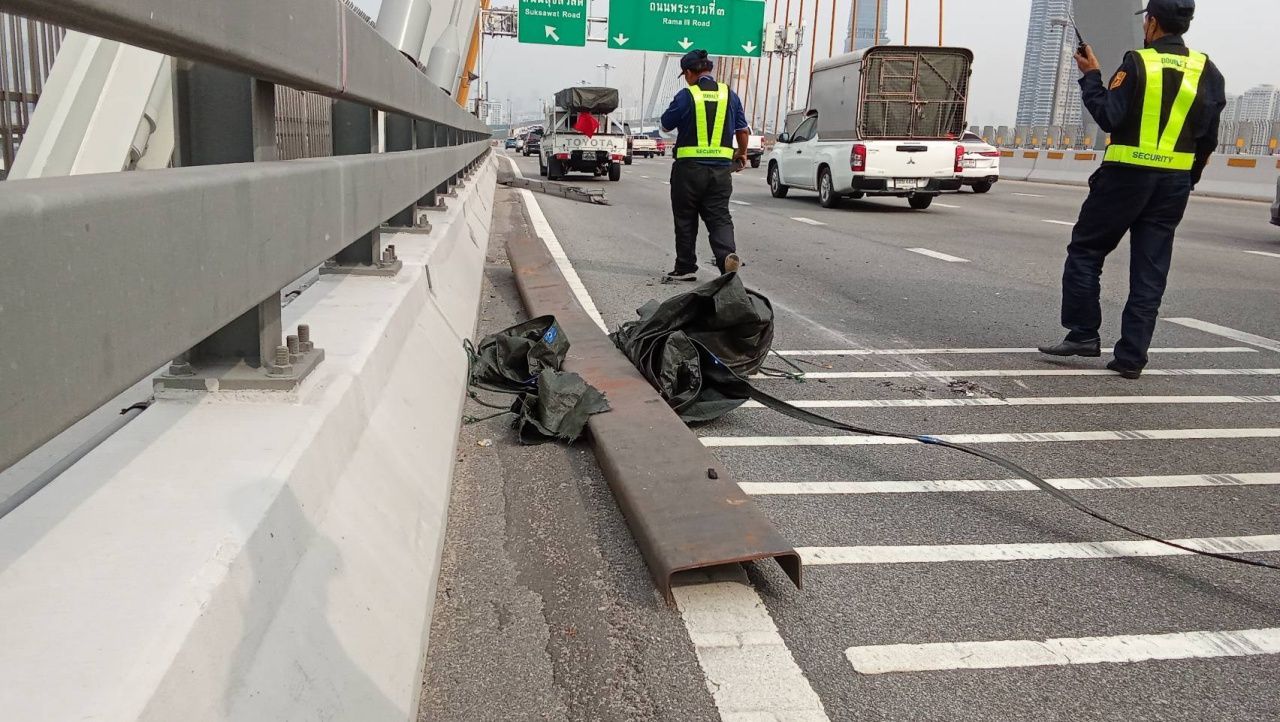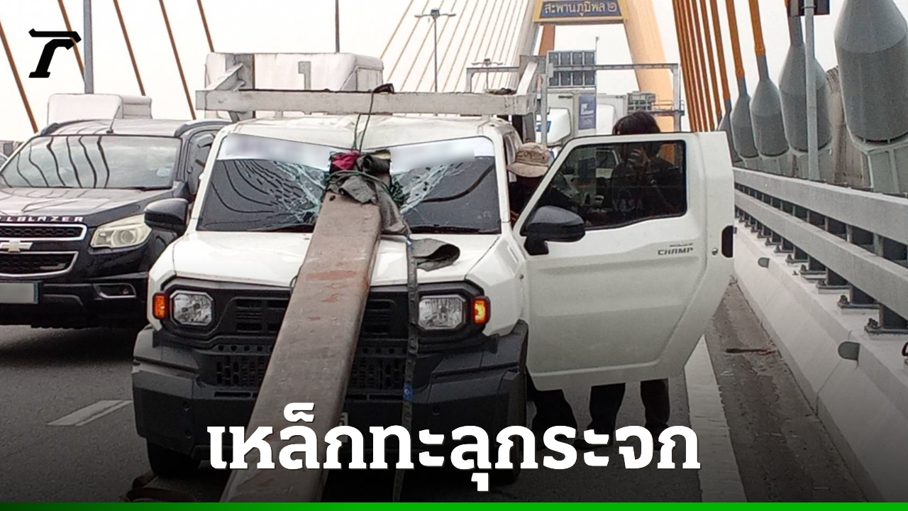 นาทีระทึก รถบรรทุกเหล็กเบรกกะทันหันบนสะพานภูมิพล 2 เหล็กสไลด์พุ่งเสียบทะลุกระจกหน้า โชคดีไร้คนเจ็บ