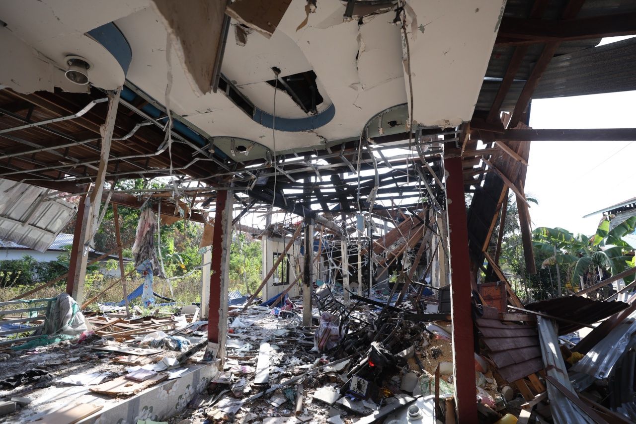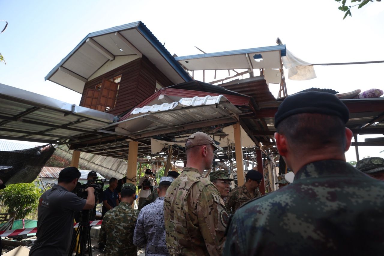 ภายหลังการรับฟังบรรยายสรุป คณะผู้ช่วยทูตทหารได้ลงพื้นที่ตรวจสอบความเสียหายบ้านเรือนประชาชนในหมู่บ้านหนองเม็ก ต.เสาธงชัย อ.กันทรลักษ์ ซึ่งถูกกระสุนปืนใหญ่ตกใส่จนได้รับความเสียหายหลายหลัง เพื่อรับทราบผลกระทบต่อพลเรือนจากเหตุปะทะตามแนวชายแดนไทย–กัมพูชา