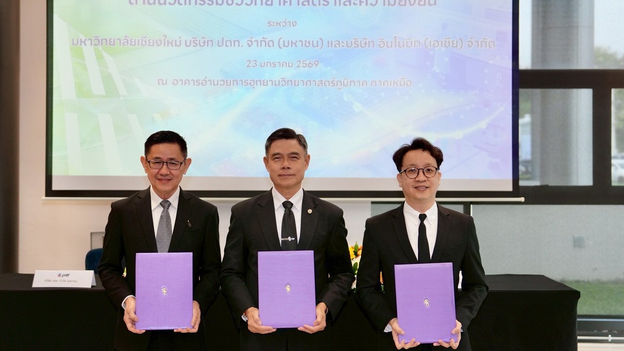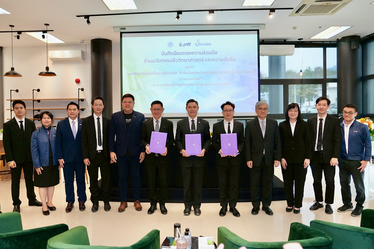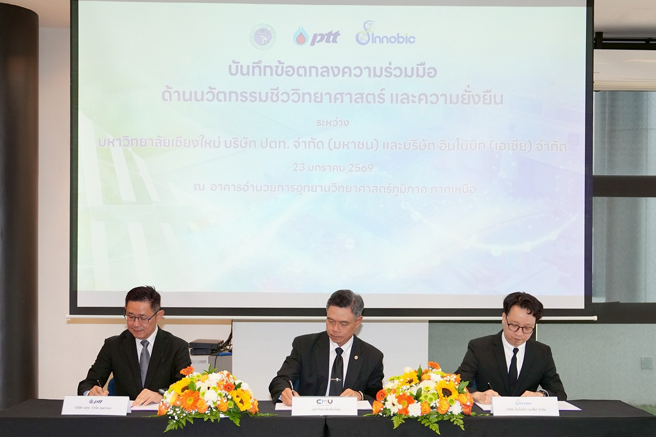 วันศุกร์ที่ 23 มกราคม 2569 มหาวิทยาลัยเชียงใหม่ (มช.) ลงนามบันทึกข้อตกลงความร่วมมือด้านนวัตกรรมชีววิทยาศาสตร์และความยั่งยืน ร่วมกับ บริษัท ปตท. จำกัด (มหาชน) และ บริษัท อินโนบิก (เอเซีย) จำกัด โดยมีเป้าหมายเพื่อส่งเสริมการพัฒนาประเทศในมิติเศรษฐกิจ สังคม และสิ่งแวดล้อมอย่างยั่งยืน ผ่านการบูรณาการองค์ความรู้ งานวิจัย และนวัตกรรมสู่การใช้ประโยชน์จริง โดยพิธีลงนามในครั้งนี้ได้รับเกียรติจาก ศาสตราจารย์ ดร.นพ.พงษ์รักษ์ ศรีบัณฑิตมงคล อธิการบดีมหาวิทยาลัยเชียงใหม่ ร่วมด้วย ดร.บุรณิน รัตนสมบัติ ประธานเจ้าหน้าที่ปฏิบัติการกลุ่มธุรกิจใหม่และความยั่งยืน บริษัท ปตท. จำกัด (มหาชน) และ ดร.ณัฐ อธิวิทวัส กรรมการผู้จัดการใหญ่ บริษัท อินโนบิก (เอเซีย) จำกัด ร่วมลงนามบันทึกข้อตกลงดังกล่าว
