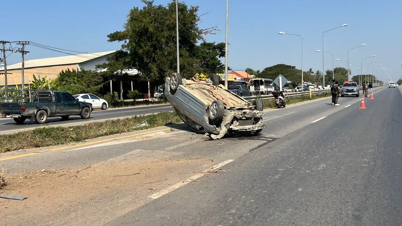 วงจรปิดนาที "หนุ่มวัย 22" มึนยา ขับเก๋งเฉี่ยวชนจักรยานยนต์หลายคัน ก่อนเสียหลักตกเกาะกลางถนน จนรถพลิกหงายท้อง