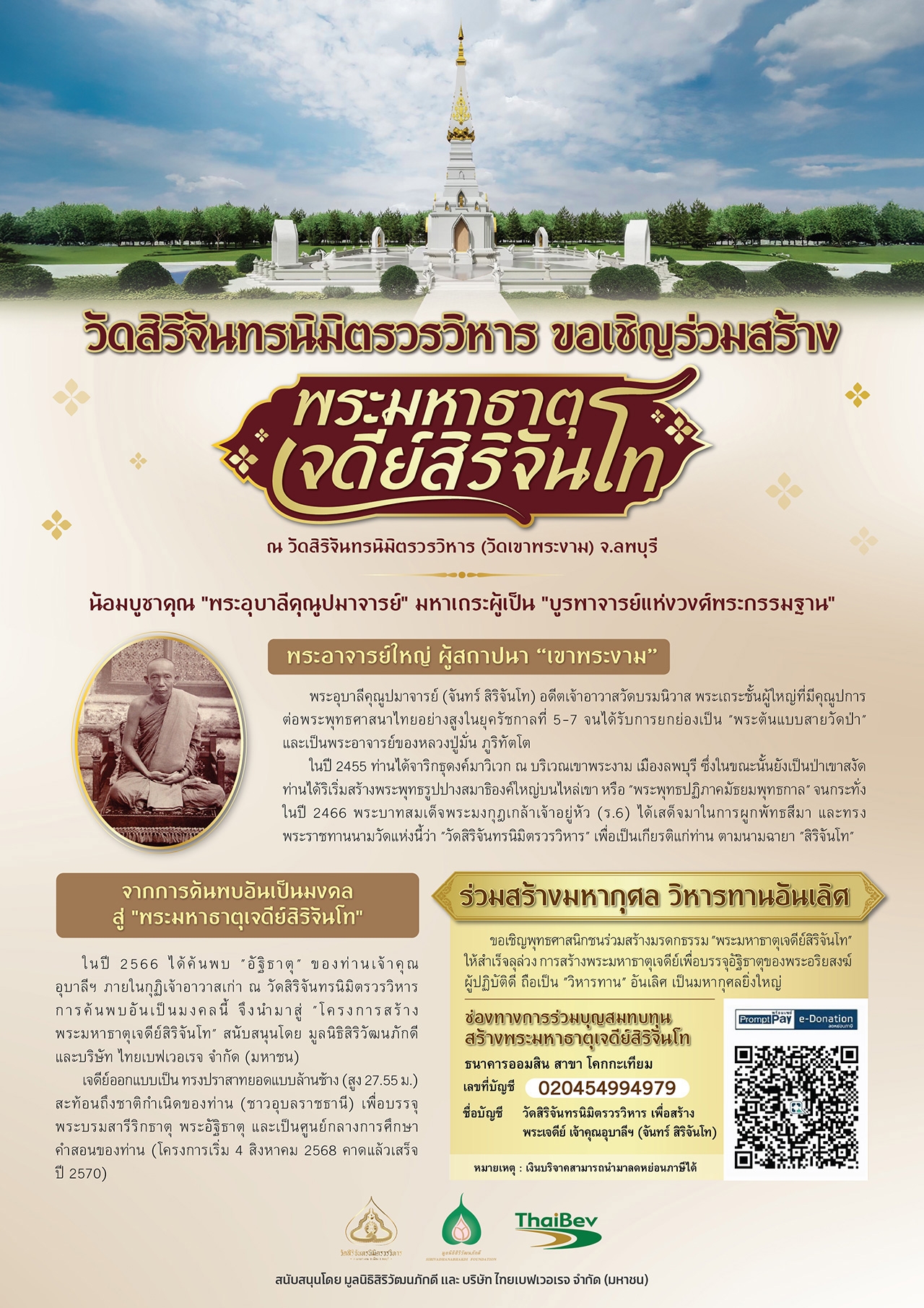 มูลนิธิสิริวัฒนภักดีและบริษัท ไทยเบฟเวอเรจ จำกัด (มหาชน) ขอเชิญร่วมสร้างมหาธาตุเจดีย์สิริจันโท เพื่อบรรจุอัฐิธาตุของพระอริยสงฆ์ โดยช่องทางการร่วมสมทบทุน ธนาคารออมสิน สาขาโคกกะเทียม เลขที่บัญชี 020454994979 ชื่อบัญชี วัดสิริจันทรนิมิตรวรวิหาร เพื่อสร้างพระเจดีย์ เจ้าคุณอุบาลีฯ (จันทร์ สิริจันโท) ซึ่งเงินบริจาคสามารถนำไปลดหย่อนภาษีได้