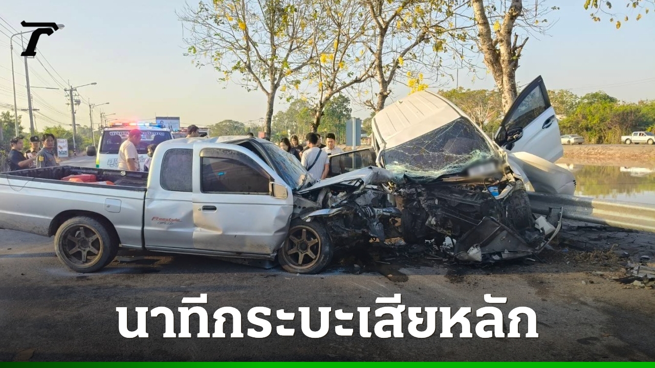 กล้องวงจรปิด จับภาพนาที "กระบะเสียหลัก" ชนรถยนต์ รอง ผอ.โรงเรียนบึงบา บาดเจ็บ ด้านเจ้าหน้าที่เตรียมสอบสวนสาเหตุของอุบัติเหตุครั้งนี้
