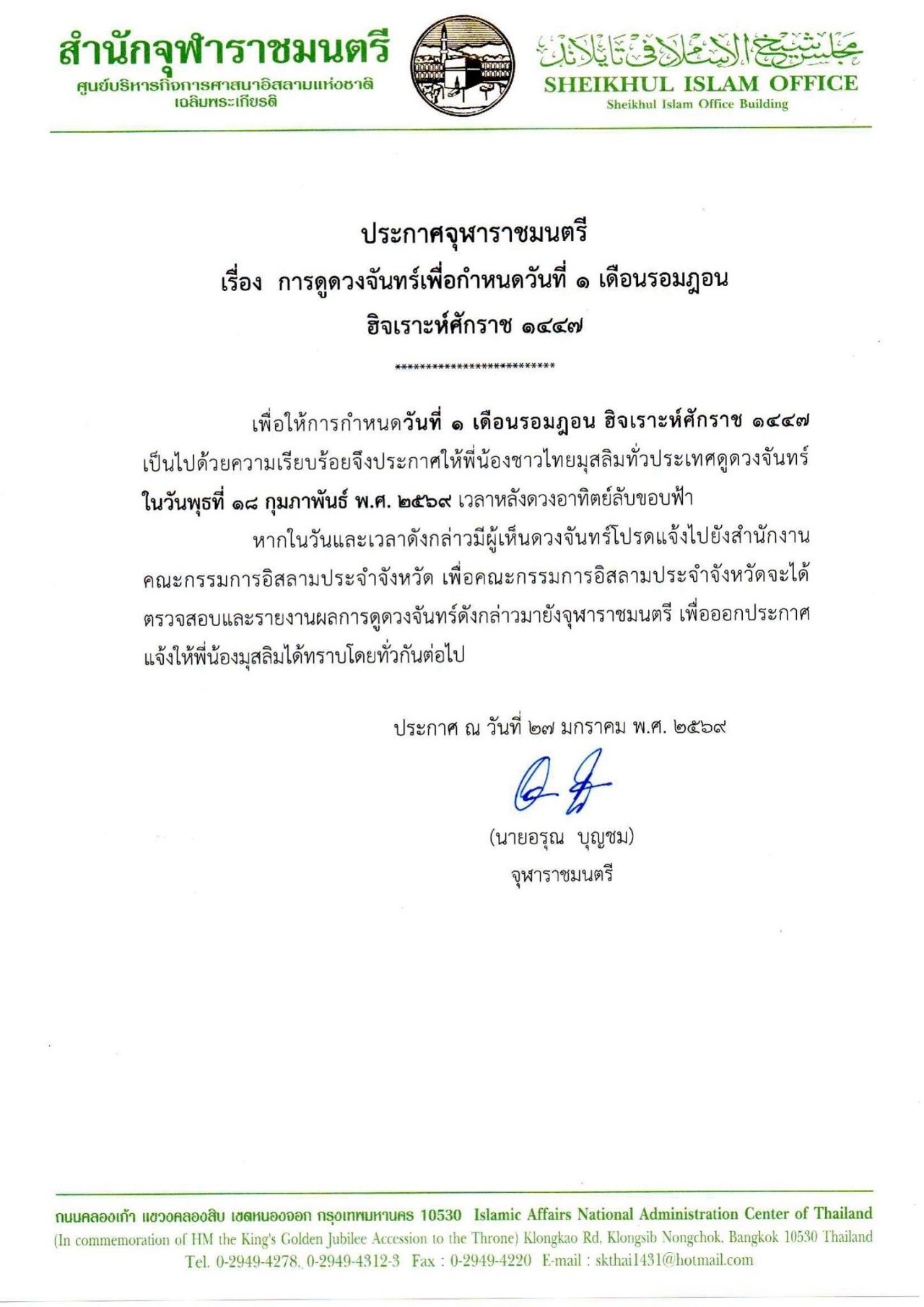 หากในวันและเวลาดังกล่าวมีผู้เห็นดวงจันทร์โปรดแจ้งไปยังสำนักงานคณะกรรมการอิสลามประจำจังหวัด เพื่อคณะกรรมการอิสลามประจำจังหวัดจะได้ตรวจสอบและรายงานผลการดูดวงจันทร์ดังกล่าวมายังจุฬาราชมนตรี เพื่อออกประกาศแจ้งให้พี่น้องมุสลิมได้ทราบโดยทั่วกันต่อไป.