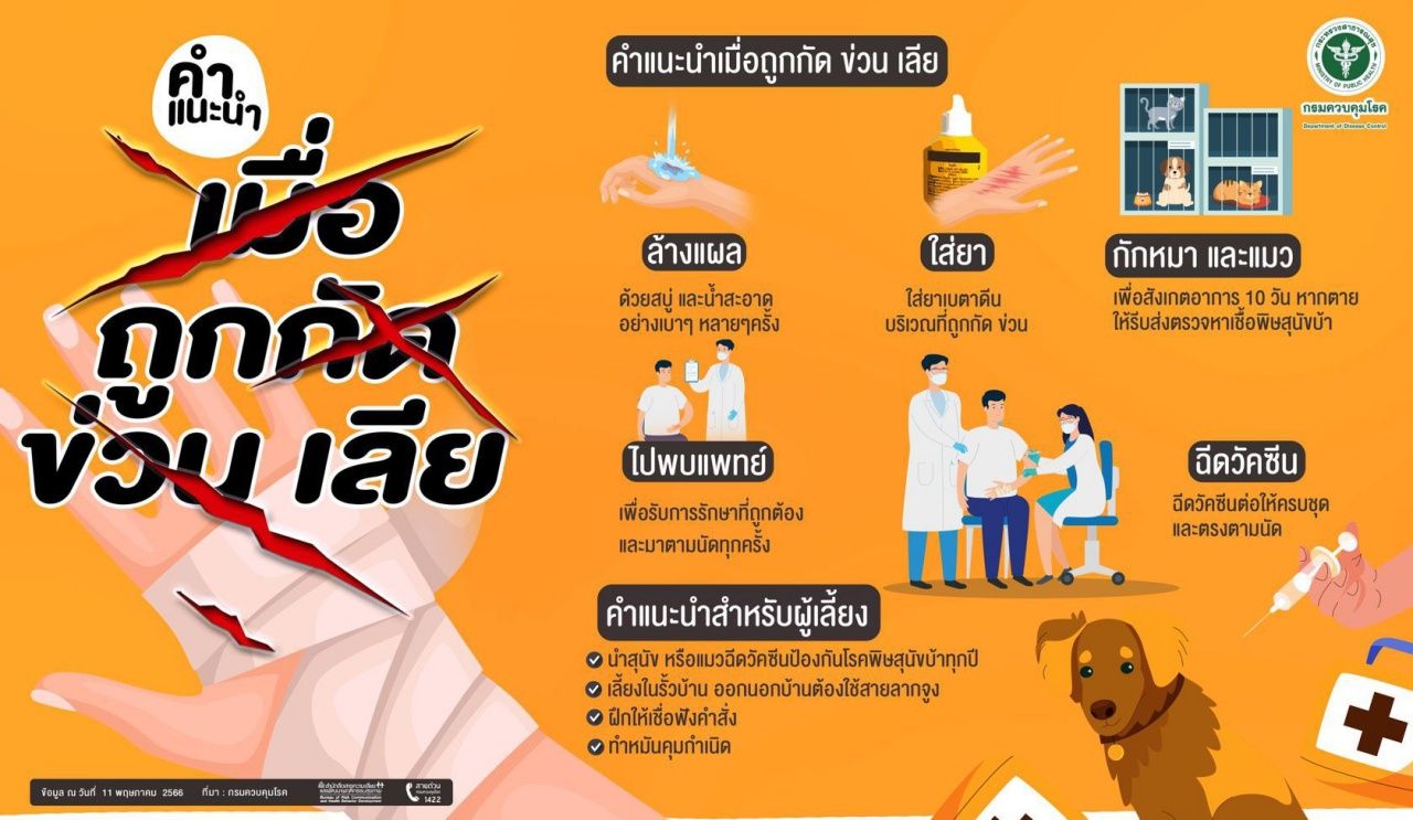หากถูกสุนัข แมว กัด ข่วน เลีย น้ำลายกระเด็นเข้าตา ปาก หรือบาดแผลแม้เพียงเล็กน้อย ต้องป้องกันอย่างถูกวิธีทันที ล้างแผล ใส่ยา หาหมอ ฉีดวัคซีนต่อให้ครบชุด เนื่องจากมีระยะฟักตัวเฉลี่ยนาน 3 เดือน เร็วสุด 4 วัน บางรายอาจเป็นปี จึงจะแสดงอาการป่วย ซึ่งเมื่อมีอาการปรากฏจะไม่มีทางรักษาและเสียชีวิตทุกราย จึงจำเป็นอย่างยิ่งที่ต้องรีบไปพบแพทย์ เพื่อรับการดูแลรักษาอย่างถูกต้องเหมาะสมโดยเร็ว