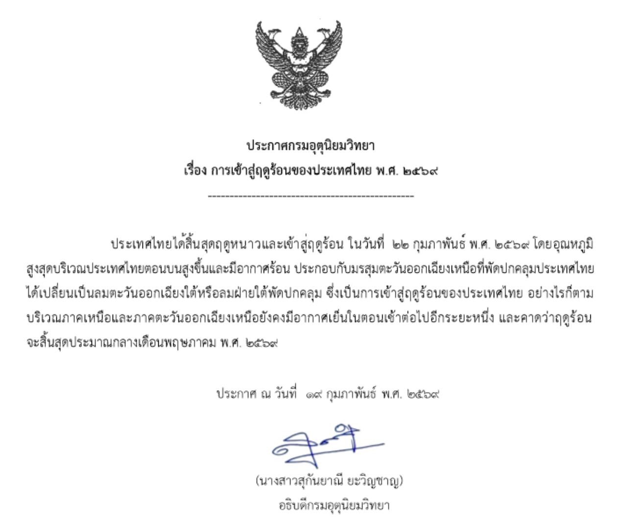 22 กุมภาพันธ์ 2569 ประเทศไทยเข้าสู่ "ฤดูร้อน" อย่างเป็นทางการแล้ว อุตฯ คาดฤดูร้อนจะสิ้นสุดประมาณกลางเดือนพฤษภาคม โดยภาคเหนือ-อีสาน จะยังคงมีอากาศเย็นในตอนเช้าต่อไปอีกระยะ