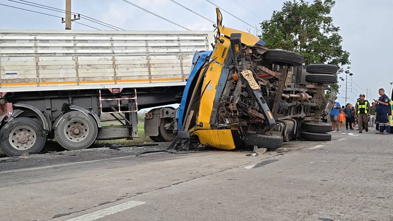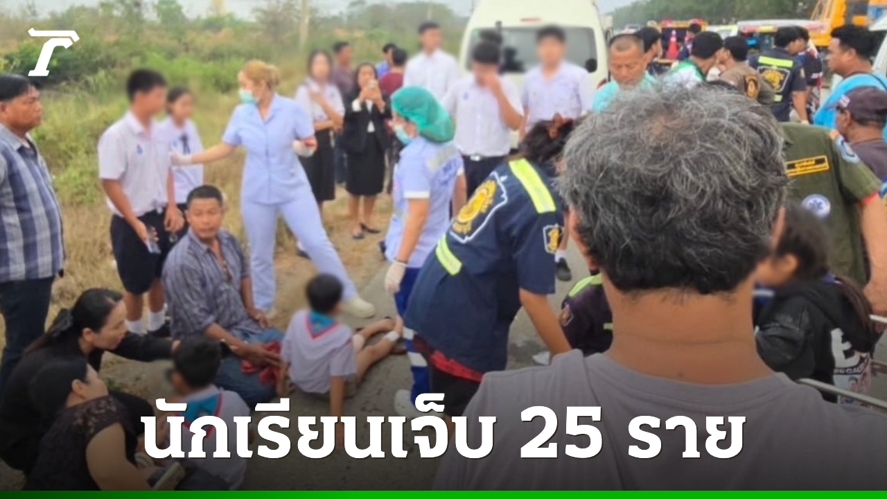 รถรับ-ส่งนักเรียน 2 คันพุ่งชนกัน ก่อนเสียหลักไปชนท้ายรถบรรทุก เด็กได้รับบาดเจ็บ 25 ราย ติดภายใน 2 ราย กู้ภัยเร่งใช้เครื่องมือตัดถ่างช่วยชีวิต