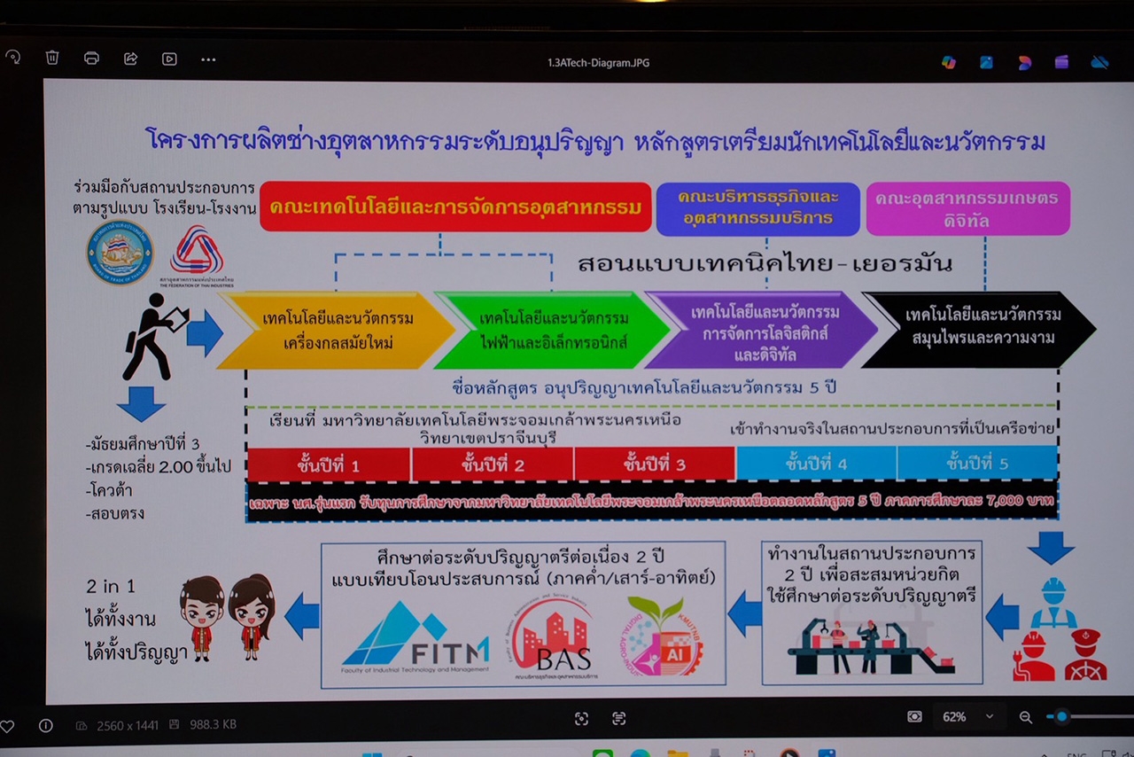 วันที่ 2 มีนาคม พ.ศ. 2569 มหาวิทยาลัยเทคโนโลยีพระจอมเกล้าพระนครเหนือ (มจพ.) ซึ่งเป็นมหาวิทยาลัย ติดอันดับ Top10 ของประเทศ จัดแถลงข่าว “มอบทุนการศึกษาให้กับนักเรียน ม.3 หลักสูตรโรงเรียน-โรงงาน รูปแบบเทคนิค ไทย-เยอรมัน” อย่างเป็นทางการ ณ ห้องประชุมราชพฤกษ์ มหาวิทยาลัยเทคโนโลยีพระจอมเกล้าพระนครเหนือ โดยนำเสนอหลักสูตรอนุปริญญา 4 สาขา ซึ่งเป็นสาขาขาดแคลนของประเทศ ได้แก่ สาขาวิชาเทคโนโลยีและนวัตกรรมเครื่องกลสมัยใหม่ (TIMM) สาขาวิชาเทคโนโลยีและนวัตกรรมไฟฟ้าและอิเล็กทรอนิกส์ (TIEE) สาขาวิชาเทคโนโลยีและนวัตกรรมการจัดการโลจิสติกส์และดิจิทัล (TILM) และสาขาวิชาเทคโนโลยีและนวัตกรรมสมุนไพรและความงาม (TIHB) ซึ่งพัฒนาบนแนวคิดระบบทวิภาคี (Dual System) ของประเทศเยอรมัน โดยการเรียนรู้ผ่านการปฏิบัติงานจริงในสถานประกอบการ ตลอดเส้นทางการศึกษา 5 ปี (3+2) เพื่อผลิตนักเทคโนโลยีอัจฉริยะ ตามความต้องการของภาคธุรกิจอุตสาหกรรมสาขาต่าง ๆ ของประเทศ