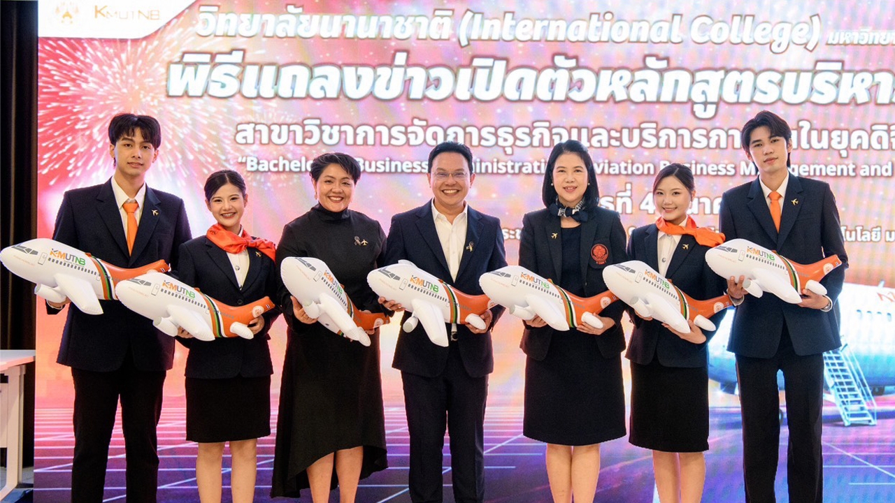 วิทยาลัยนานาชาติ มหาวิทยาลัยเทคโนโลยีพระจอมเกล้าพระนครเหนือ (มจพ.) แถลงข่าวพร้อมเทคออฟ! เปิดตัวหลักสูตรใหม่ ABMS (Aviation Business Management and Service in the Digital Age) ปั้น “Solution Seeker” นักจัดการขั้นเทพ สู่อุตสาหกรรมการบินระดับโลก สัมผัสประสบการณ์เรียนสุดล้ำกับเครื่อง Boeing 737 แบบเต็มลำของจริง จัดแถลงข่าวในวันที่ 4 มีนาคม 2569 โดยมี ศ.ดร.ธานินทร์ ศิลป์จารุ อธิการบดี กล่าวต้อนรับ พร้อมด้วย ผศ.ดร.อัจฉรียา รอบกิจ คณบดีวิทยาลัยนานาชาติ กล่าวถึงรายละเอียดหลักสูตร มีคณะผู้บริหารเข้าร่วมแถลงข่าว นำโดย ศ.ดร.ธีรวุฒิ บุณยโสภณ นายกสภามหาวิทยาลัย ซึ่งแถลงข่าวครั้งนี้ได้รับความสนใจจากผู้บริหารสถานศึกษา นักเรียน ผู้ปกครอง และหน่วยงานต่าง ๆ เข้าร่วมรับฟังเป็นจำนวนมาก อาทิ รร.นานาชาติคริสเตียน, รร.มารีวิทยา, รร.ดรุณพัฒน์, รร.อนุราชประสิทธิ์, รร.เตรียอุดมพัฒนาการ, รร.เขมาภิรตาราม, สำนักงานการบินพลเรือนแห่งประเทศไทย, กองประสานงานการบินไทย, สหพันธ์นักบินนานาชาติ ฯลฯ ณ ห้องประชุม Cloud 9 สำนักวิจัยวิทยาศาสตร์และเทคโนโลยี มจพ.