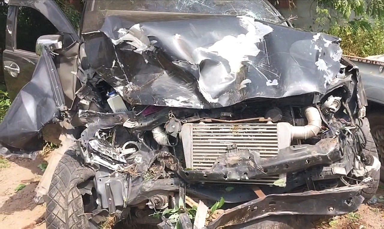 หนุ่มศรีสะเกษถูกรถขับตัดหน้า รีบหักหลบทำรถตีลังกาข้ามเกาะหลายตลบ รถพังยับเยิน ส่วนคนไร้เจ็บ มีแค่รอยถลอกนิดหน่อย