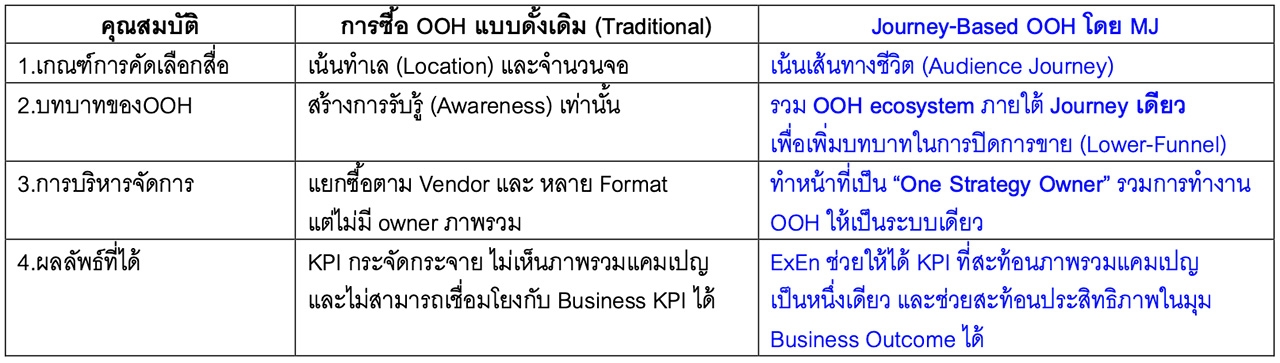 Journey-Based OOH จึงเป็นการวางแผนสื่อนอกบ้านที่ยึดเอา "เส้นทางตัดสินใจ" ของผู้บริโภคเป็นตัวตั้ง แทนที่จะยึดติดกับจำนวนจอหรือทำเลทองเพียงอย่างเดียว”