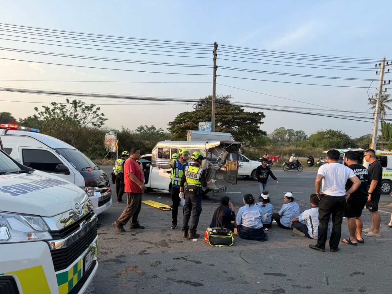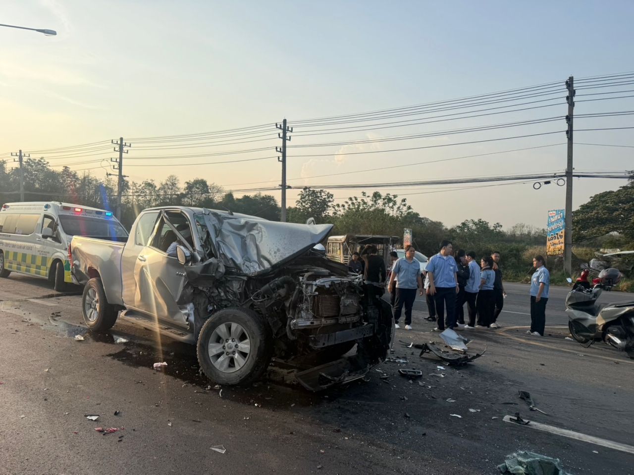 พบผู้บาดเจ็บ เป็นพนักงานบริษัทแห่งหนึ่งที่อยู่ในรถกระบะสองแถว โตโยต้า สีขาว ทะเบียน นครราชสีมา ทั้งหญิงและชาย จำนวน 8 ราย รวมทั้ง นายเฉลิม อายุ 58 ปี คนขับ ส่วนใหญ่ศีรษะแตก เจ็บตามร่างกาย สภาพด้านหน้าพังยุบ จากการพุ่งชนท้ายรถตู้ โตโยต้า รุ่นคอมมิวเตอร์ สีบรอนซ์ ทะเบียน นครราชสีมา ซึ่งเป็นของบริษัทเดียวกัน มีผู้ขับขี่ และผู้โดยสารมาด้วย 4 คน ได้รับบาดเจ็บเล็กน้อย