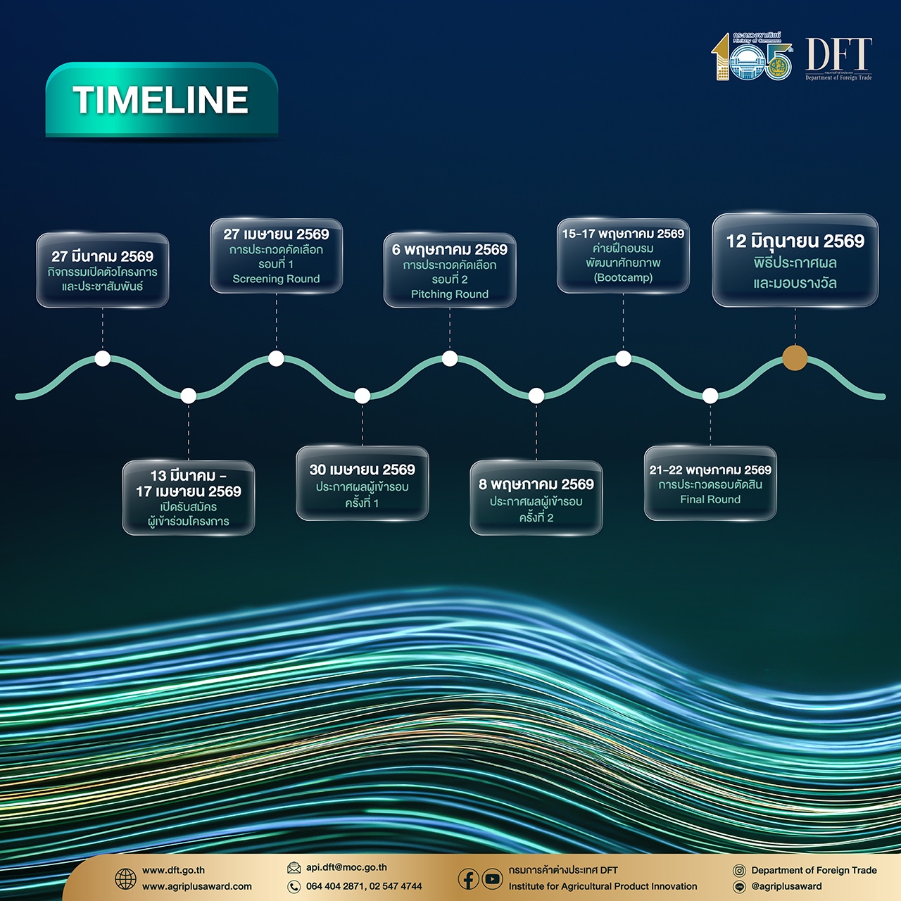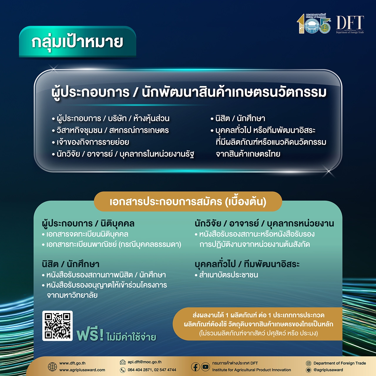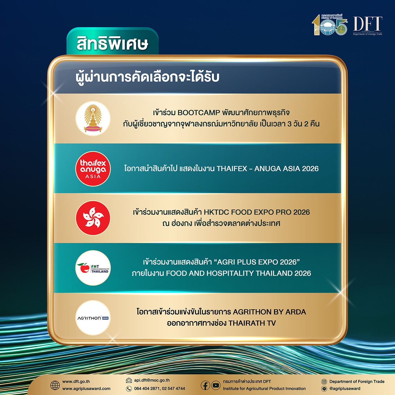 ทั้งนี้ ผู้ที่สนใจสามารถส่งผลงานเข้าร่วมประกวด Agri Plus Award 2026 ได้ตั้งแต่ วันนี้ – 17 เมษายน 2569 ทาง https://agriplusaward.com/ หรือติดตามข้อมูลข่าวสาร ได้ทางเว็บไซต์กรมการค้าต่างประเทศ www.dft.go.th หรือ Facebook : กรมการค้าต่างประเทศDFT หรือ Institute for Agricultural Product Innovation หรือโทร. 064-404-2871, 02-547-4744